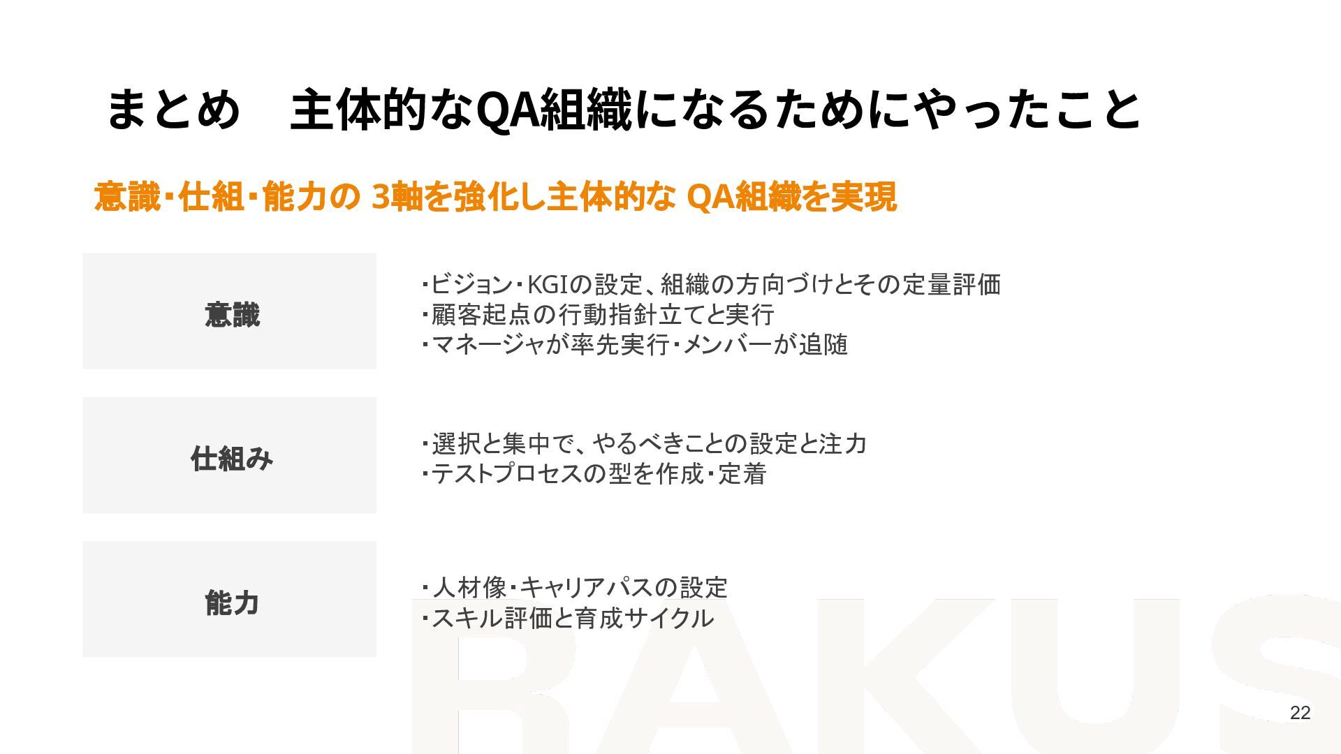 ・マネージャが率先実行・メンバーが追随 ・選択と集中で、やるべきことの設定と注力 ・テストプロセスの型を作成・定着 ・人材像・キャリアパスの設定 ・スキル評価と育成サイクル