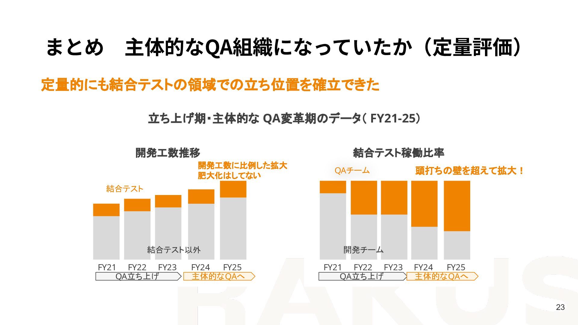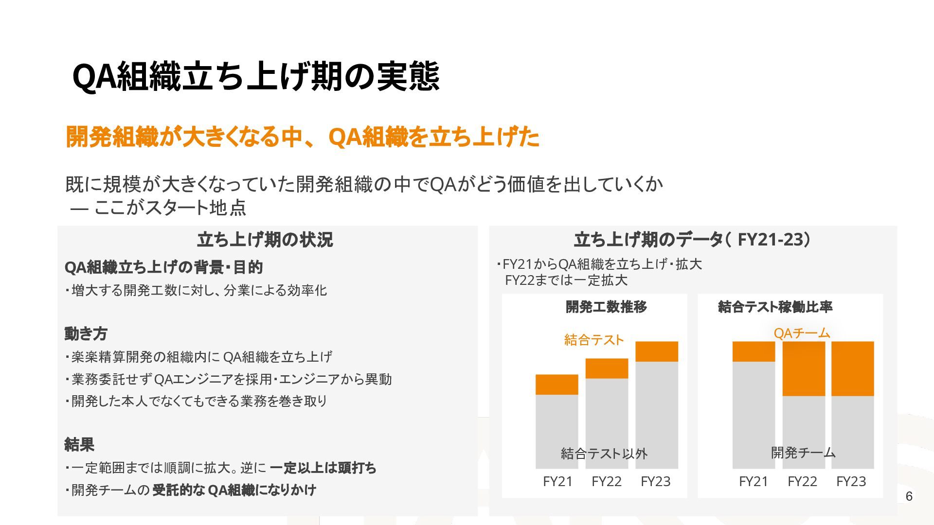FY21 FY22 FY23 結合テスト稼働比率 FY24 FY25 FY24 FY25 QA立ち上げ 主体的なQAへ QA立ち上げ 主体的なQAへ 頭打ちの壁を超えて拡大! 結合テスト 結合テスト以外 QAチーム 開発チーム 開発工数に比例した拡大 肥大化はしてない