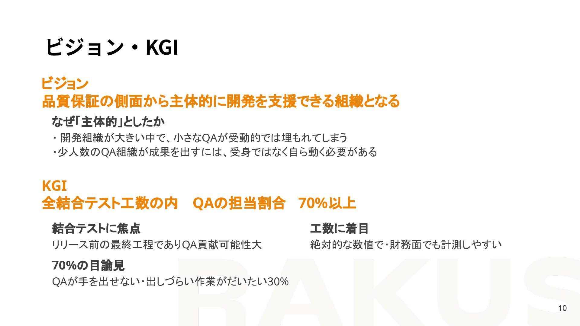 4. ビジョン‧KGI 10 ビジョン 品質保証の側面から主体的に開発を支援できる組織となる なぜ「主体的」としたか ・ 開発組織が大きい中で、小さなQAが受動的では埋もれてしまう ・少人数のQA組織が成果を出すには、受身ではなく自ら動く必要がある KGI 全結合テスト工数の内