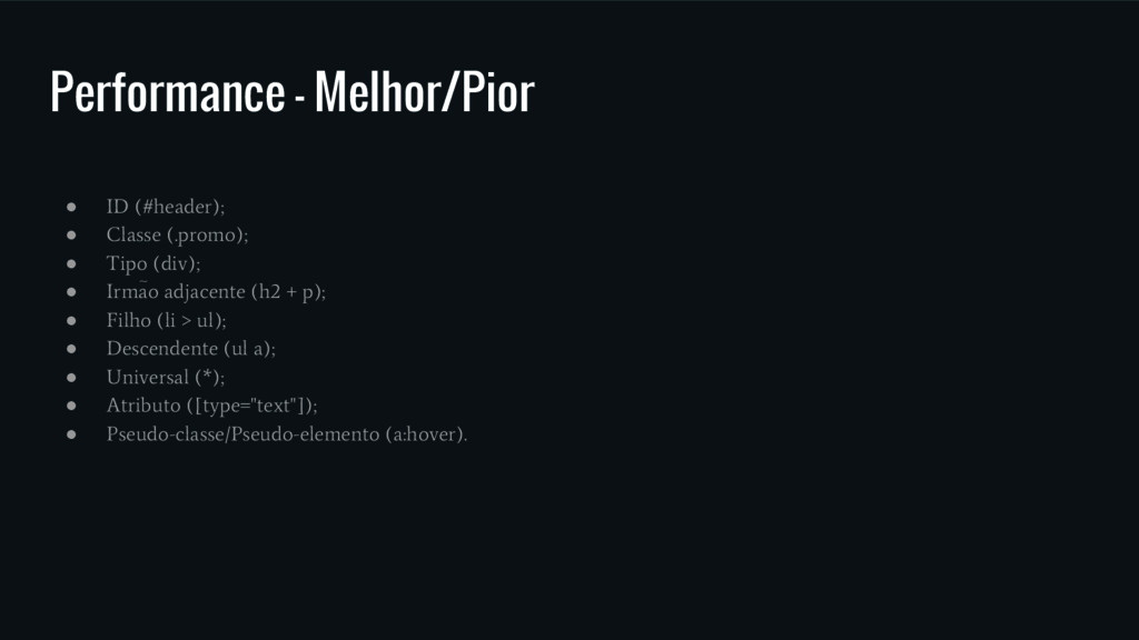 Abordagem rápida sobre alguns conceitos de CSS , seletores e seus pesos (especificidade) e um pouco de Performance