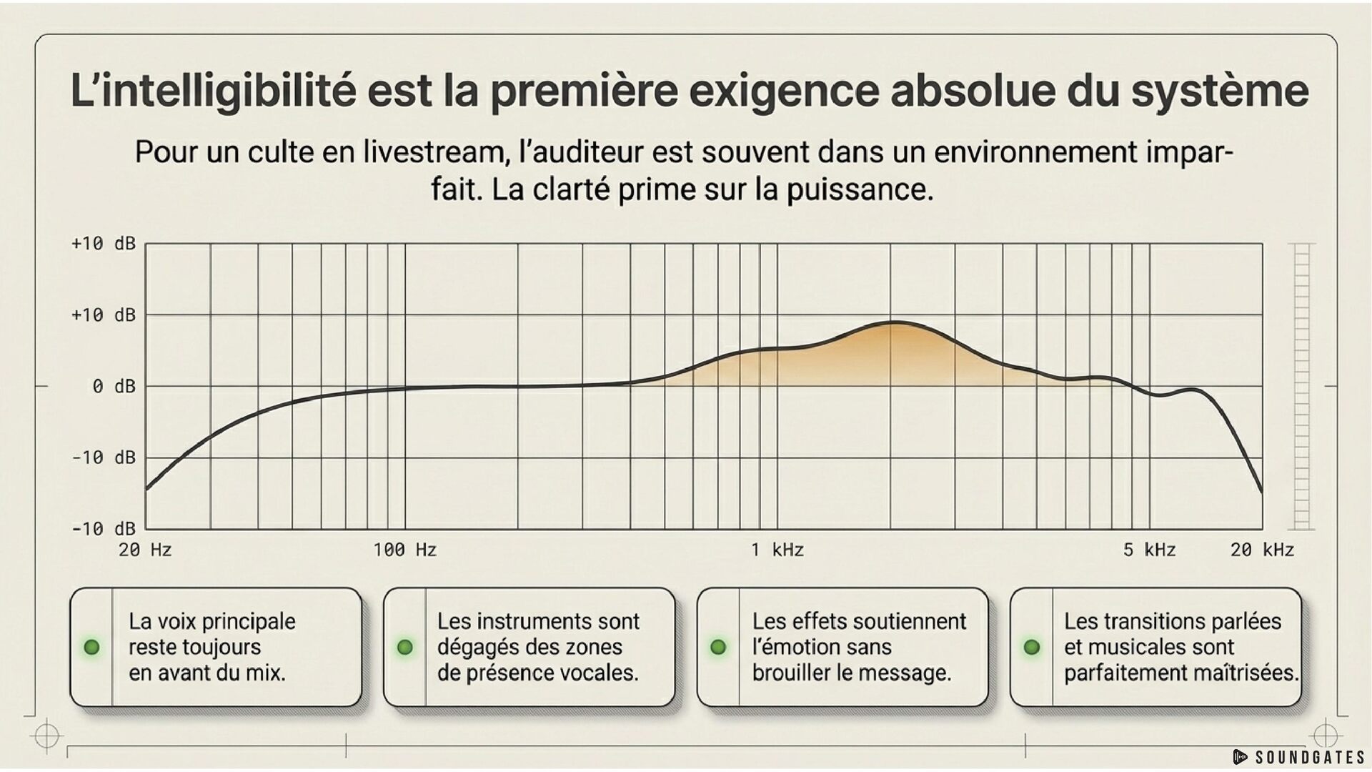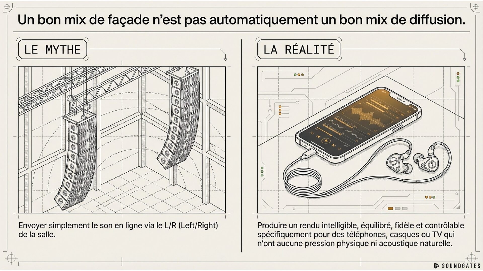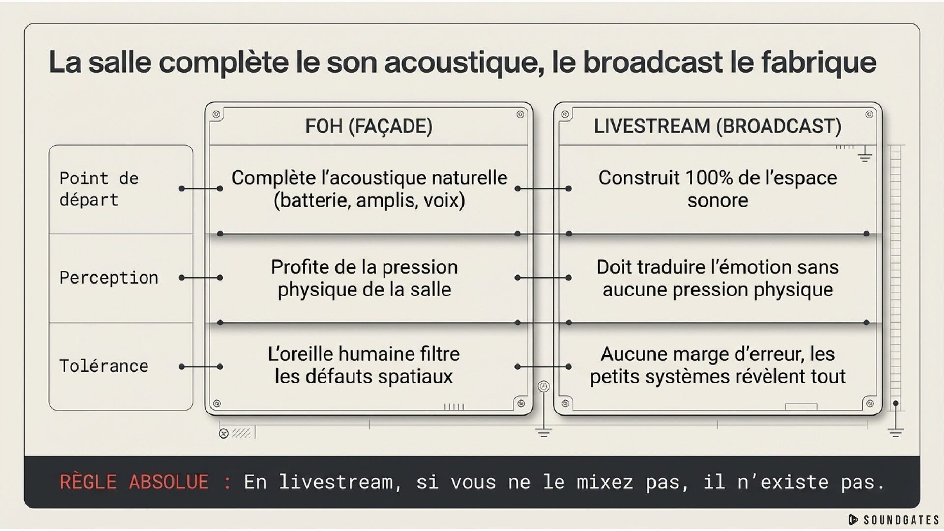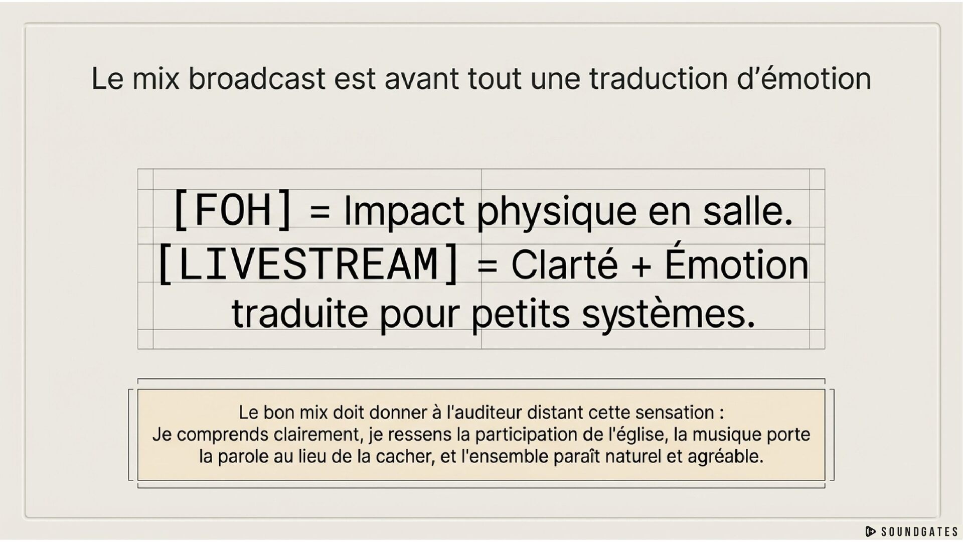 MIX AUDIO EN BROADCAST est une mini‑formation issue de SoundGates Academy pour apprendre à construire un mix de livestream clair, intelligible et émotionnel pour l’évènement en ligne, différent du simple L/R de façade. Elle présente les principes clés pour traduire le Speech et la Musique sur petits systèmes (téléphones, casques, TV) sans perdre l’impact émotionnel ni noyer la voix dans la musique.