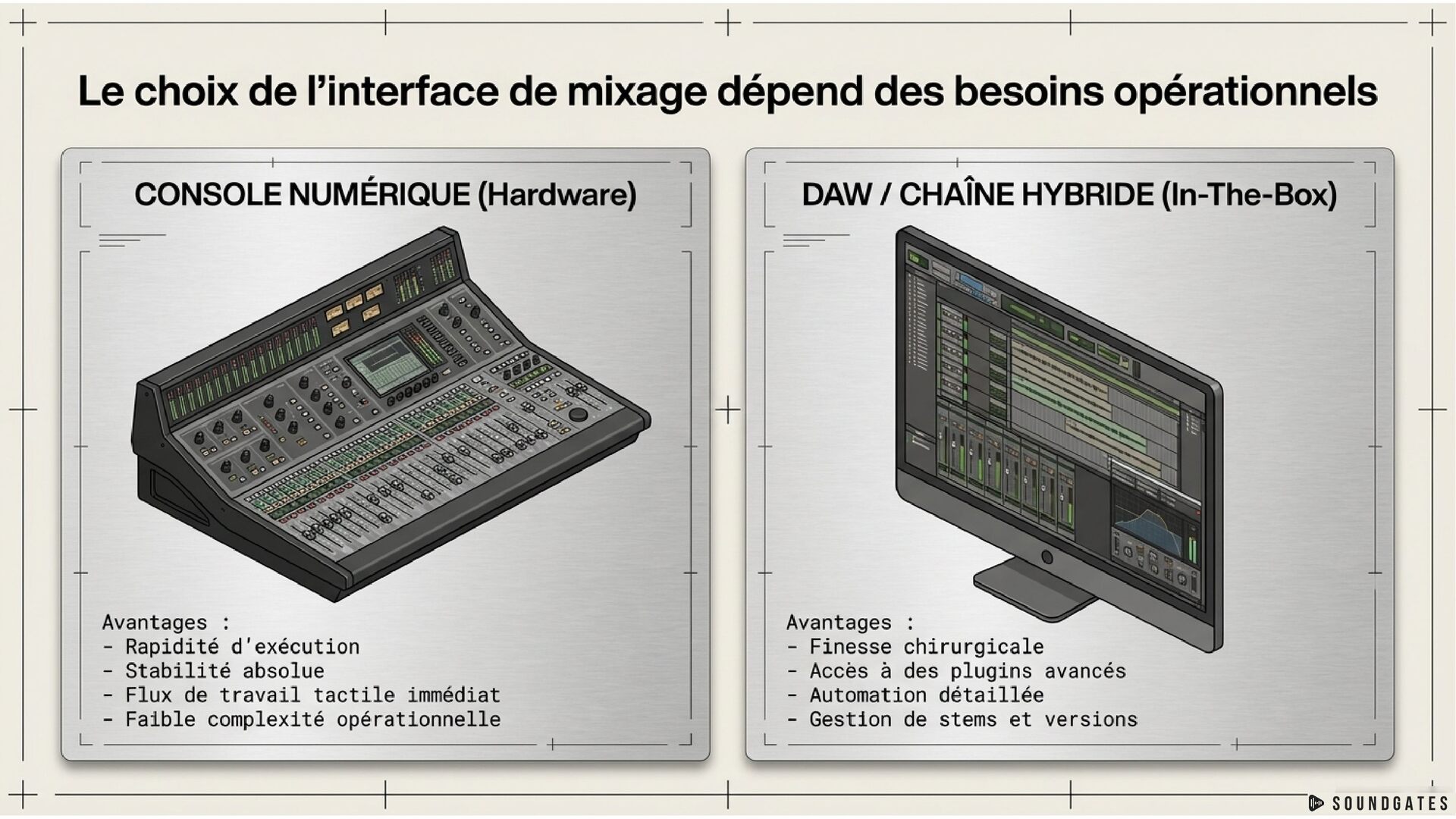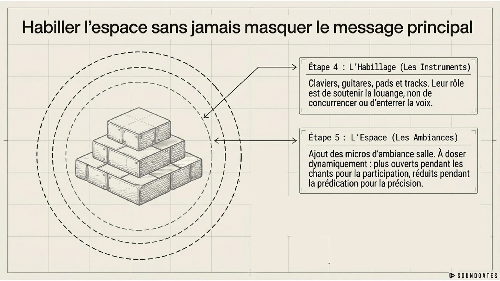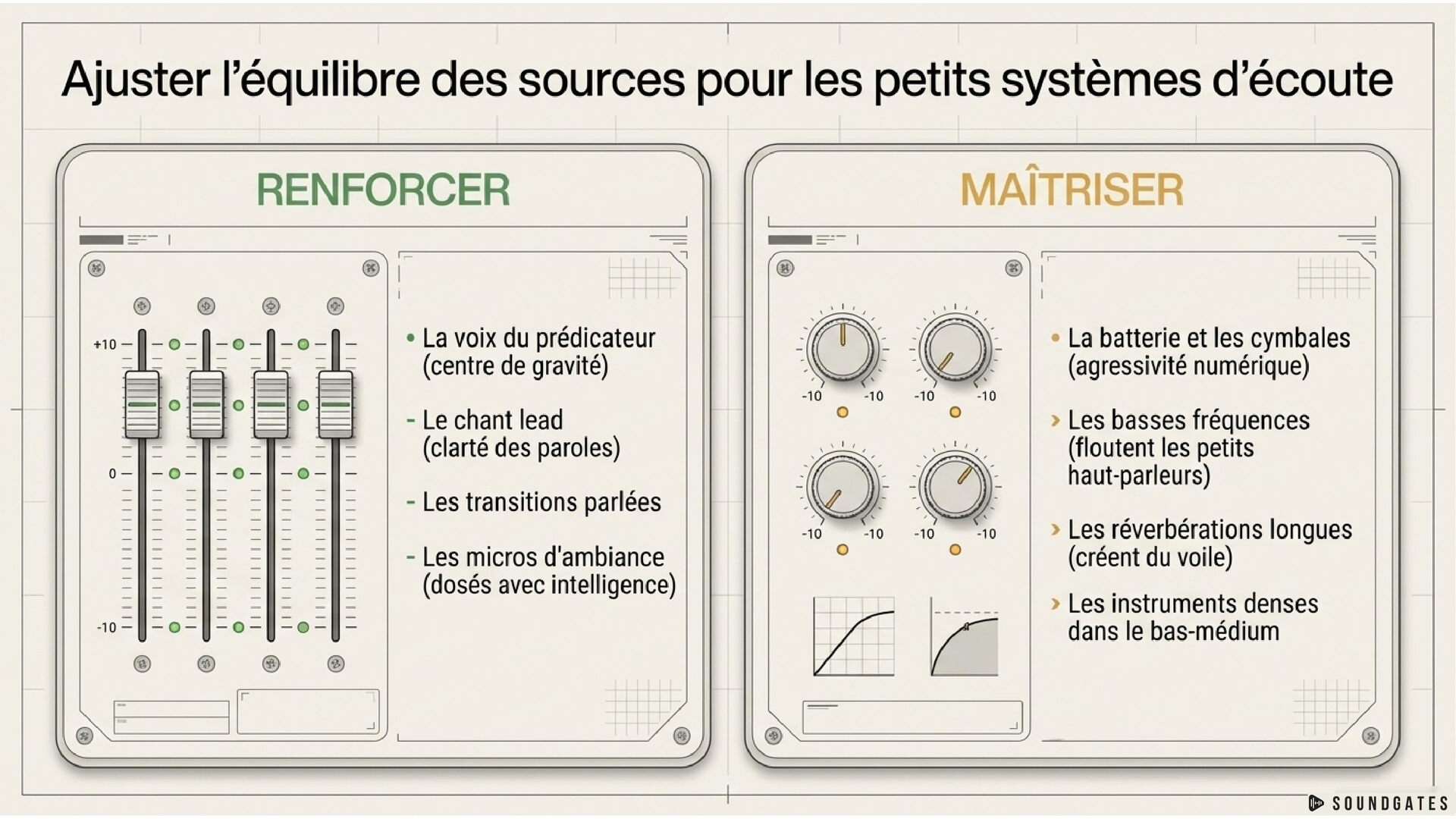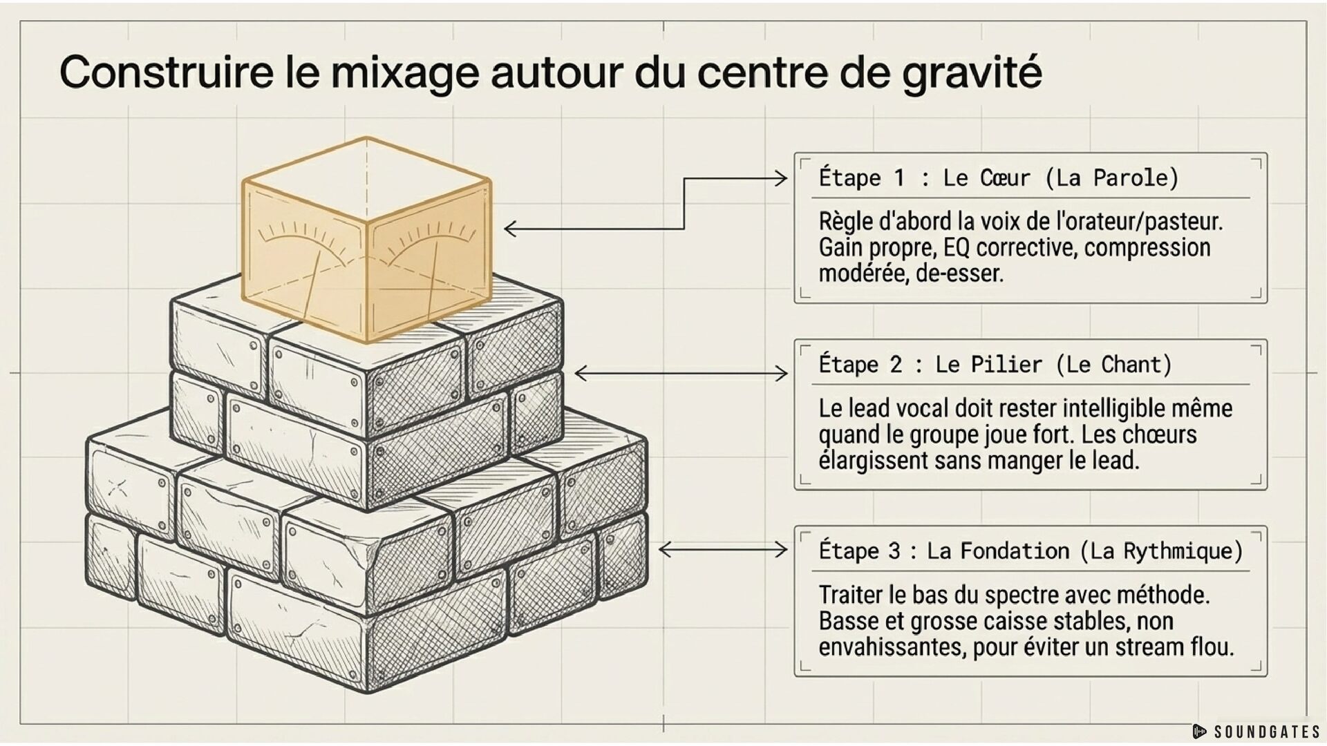 MIX AUDIO EN BROADCAST est une mini‑formation issue de SoundGates Academy pour apprendre à construire un mix de livestream clair, intelligible et émotionnel pour l’évènement en ligne, différent du simple L/R de façade. Elle présente les principes clés pour traduire le Speech et la Musique sur petits systèmes (téléphones, casques, TV) sans perdre l’impact émotionnel ni noyer la voix dans la musique.