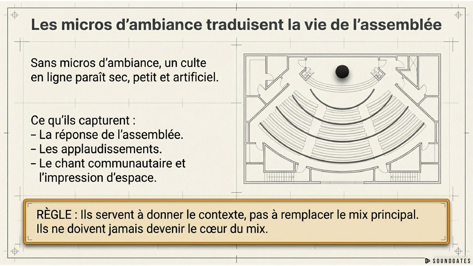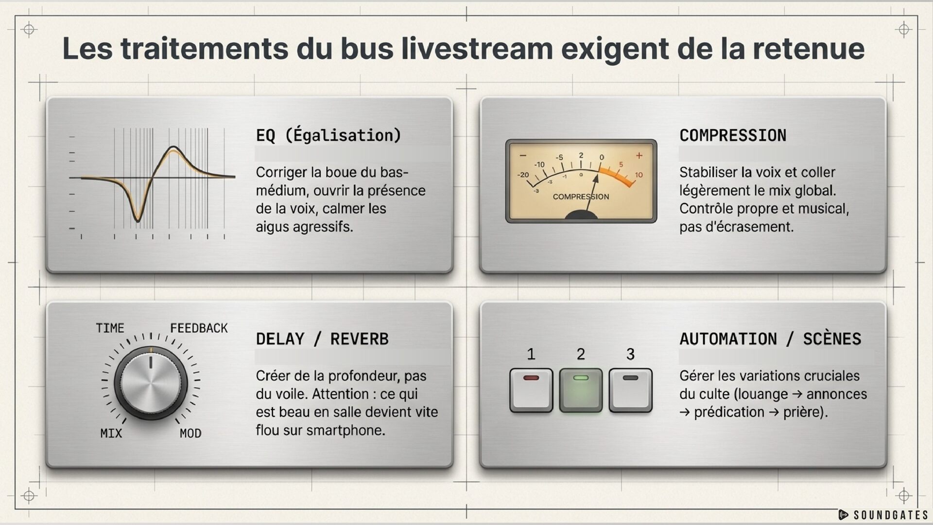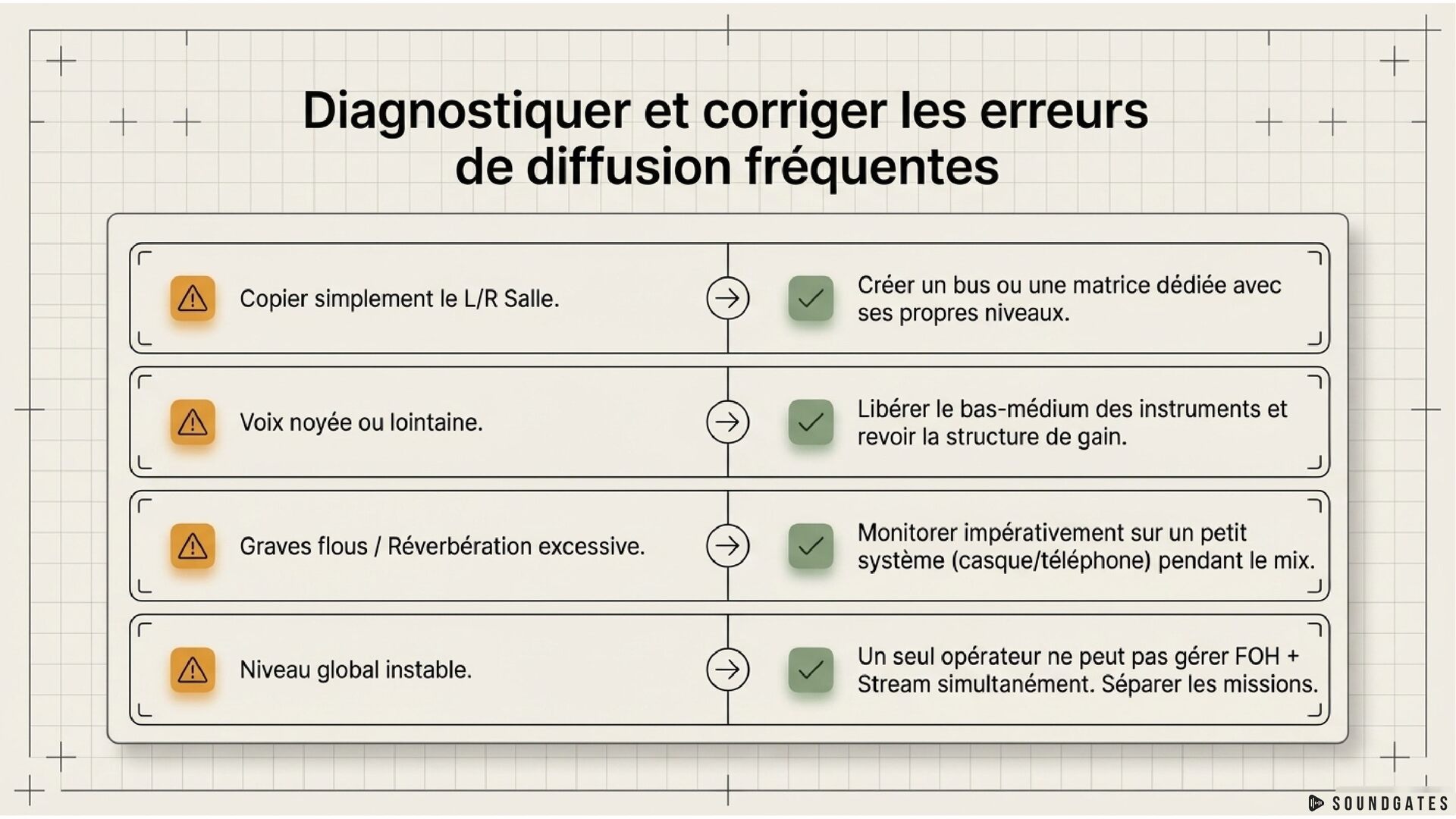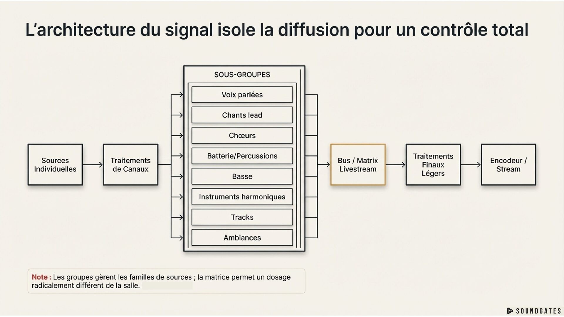 Au fil des 13 slides, le document aborde : la différence FOH/broadcast, l’intelligibilité comme priorité, l’architecture de bus/matrices dédiée au stream, l’équilibre des sources, le rôle des micros d’ambiance, les traitements du bus livestream (EQ, compression, effets) et les erreurs fréquentes à éviter pour la diffusion en direct.