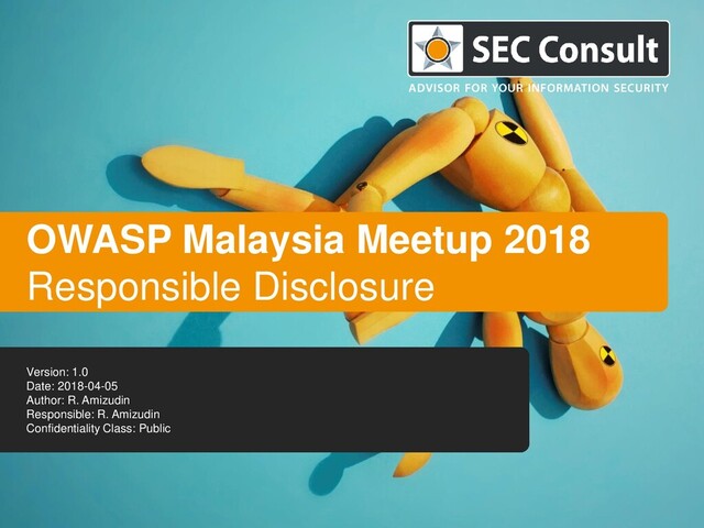 [--Title--] | Responsible: [--Responsible--] Version / Date: [--VX.X / YYYY-MM-DD--] | Confidentiality Class: [--Confidentiality Class--] © 2013 SEC Consult Unternehmensberatung GmbH All rights reserved Title: [--Title--] | Responsible: [--Responsible--] Version / Date: [--VX.X / YYYY-MM-DD--] | Confidentiality Class: [--Confidentiality Class--] © 2014 SEC Consult Unternehmensberatung GmbH All rights reserved Title: OWASP 2018 Q1 – Responsible Disclosure | Responsible: R. Amizudin Version / Date: 1.0 / 2018-04-05 | Confidentiality Class: Public © 2018 SEC Consult Malaysia Sdn. Bhd. All rights reserved Contact 27 LITHUANIA UAB Critical Security, a SEC Consult company Sauletekio al. 15-311 10224 Vilnius Tel +370 5 2195535 Email