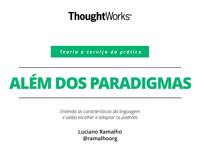 Go Python Funções de 1ª classe ✔ ∗ ✔ ✔ ✔ Tipos de 1ª classe ✔ ✔ Iteradores ∗ ✔ ∗ ✔ Modelo de variáveis referência valor* valor e referência valor* e referência referência Checagem de tipos dinâmica estática estática estática dinâmica Expressão de tipos estrutural nominal nominal estrutural estrutural