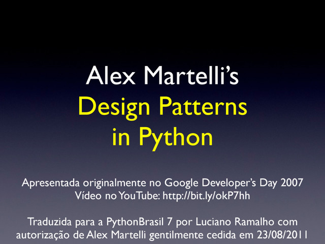 Developer’s Day 2007 Vídeo no YouTube: http://bit.ly/okP7hh Traduzida para a PythonBrasil 7 por Luciano Ramalho com autorização de Alex Martelli gentilmente cedida em 23/08/2011