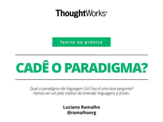 t i c a CADÊ O PARADIGMA? Qual o paradigma da linguagem Go? Isso é uma boa pergunta? Vamos ver um jeito melhor de entender linguagens a fundo. Luciano Ramalho @ramalhoorg