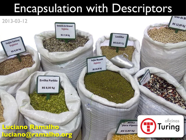 Traceback (most recent call last): ... ValueError: value must be > 0 >>> raisins.weight 10 @ramalhoorg ➋ the second doctest looks like a violation of encapsulation but business logic is enforced weight is unchanged