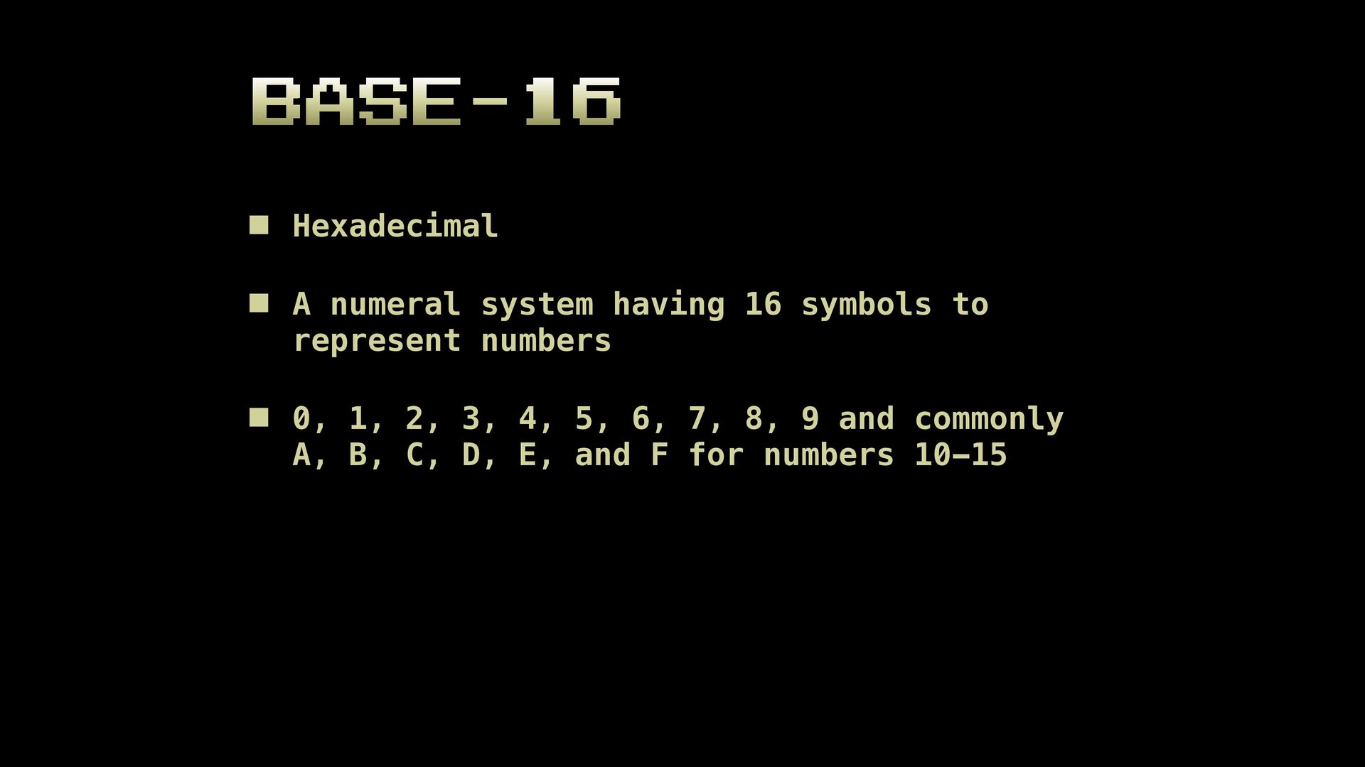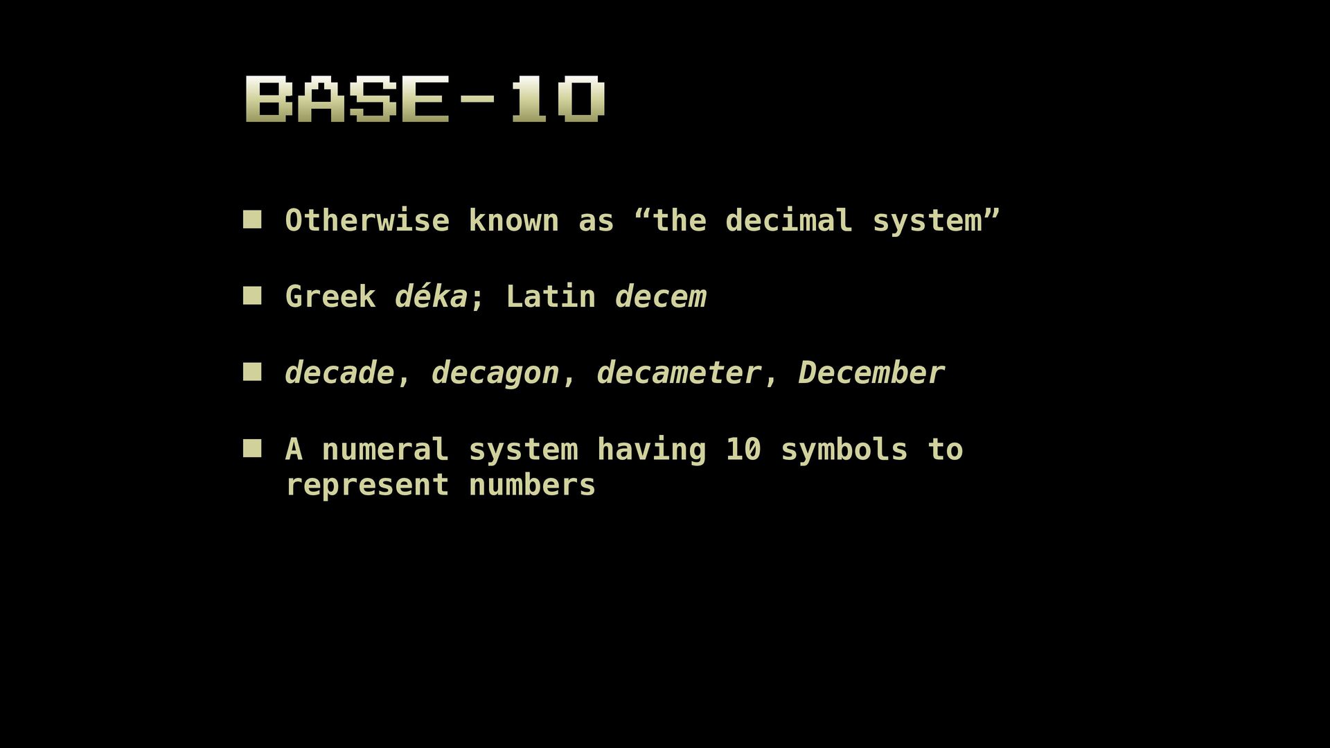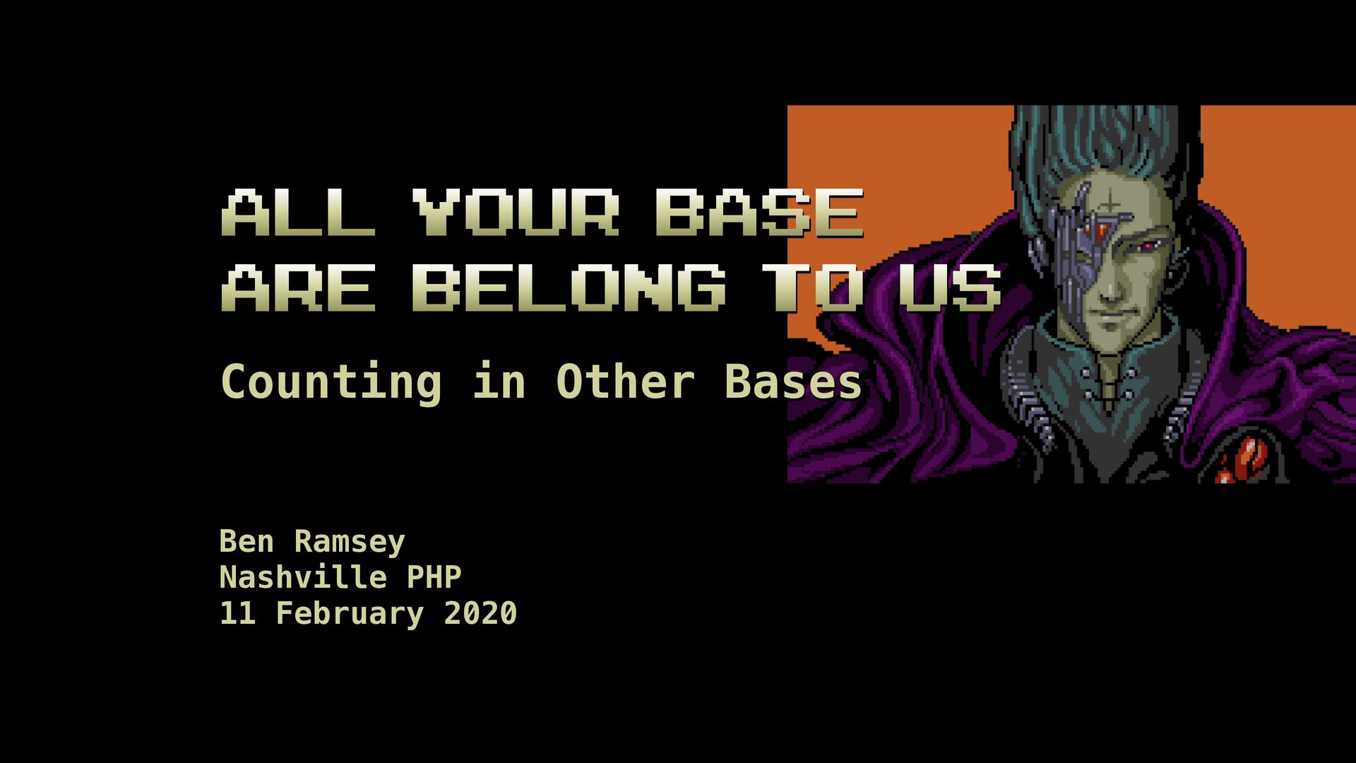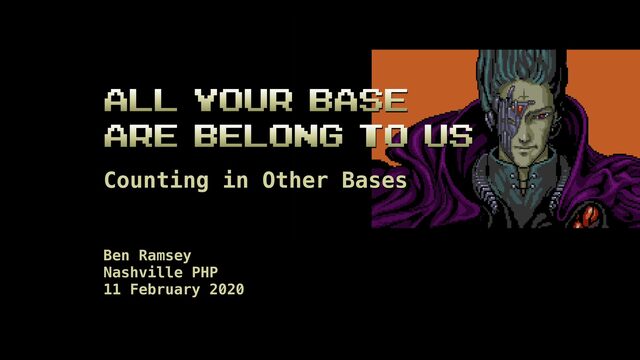 In this talk, we'll learn how to count in other bases, and we'll learn how to convert a number in any base to its base-10 equivalent, without code or a special calculator. We'll explore the most common bases we encounter in our profession (binary, octal, hexadecimal), and we'll play around with some uncommon ones (unary, ternary, duodecimal, sexagesimal, etc.). By the end, all the bases will belong to you!