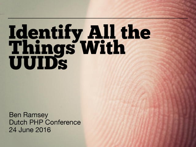 Universally unique identifiers (UUIDs) are a fun and exciting way to identify things. We can issue UUIDs forever and never run out; they're practically unique! Join this whirlwind adventure in search of the perfect identifier to find out why UUIDs might be good for your projects. Along the way, you'll learn what is a UUID, the various types of UUIDs, pros and cons of using UUIDs, and how to use the ramsey/uuid library. Advanced and little-known features of ramsey/uuid will be covered.