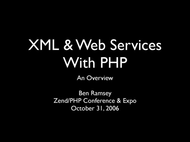 What is XML? What are Web Services? This talk will answer both of these questions, exploring ways to use the powerful features of PHP 5 to consume and create XML-based Web Services. Topics will include SOAP, XML-RPC, and REST, giving real-world examples and explaining the differences between and benefits of each.