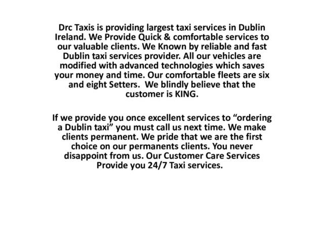 rc Taxis is providing largest taxi services in Dublin Ireland. We Provide Quick & comfortable services to our valuable clients. We Known by reliable and fast Dublin taxi services provider. All our vehicles are modified with advanced technologies which saves your money and time. Our comfortable fleets are six and eight Setters. We blindly believe that the customer is KING.