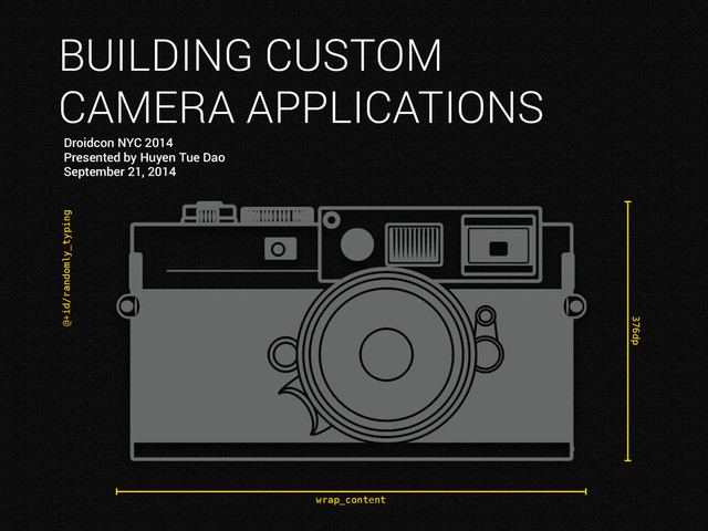 Owner Randomly Typing ! @queencodemonkey ! [email protected] randomlytyping.com ! speakerdeck.com/randomlytyping slideshare.net/randomlytyping 34 Code will coming to github ! Things To check out ! Building Apps with Multimedia: Capturing Photos developer.android.com/training/camera/ index.html ! Android Design in Action: Camera Apps youtube.com/watch?v=OLSa7fErTAM ! Standford Digital Image Processing Class stanford.edu/class/ee368/Android/index.html ! DevBytes: Android L - Camera2 API youtube.com/watch?v=Xtp3tH27OFs ! Sample Camera 2 API app: github.com/googlesamples/android- Camera2Basic/blob/master/Camera2BasicSample ! Digital Camera Sensor Sizes gizmag.com/camera-sensor-size-guide/26684/