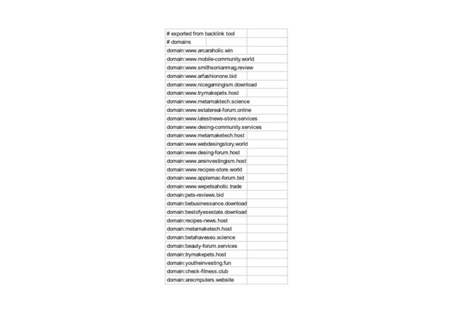 # exported from backlink tool # domains domain:www.arcaraholic.win domain:www.mobilecommunity.world domain:www.smithsonianmag.review