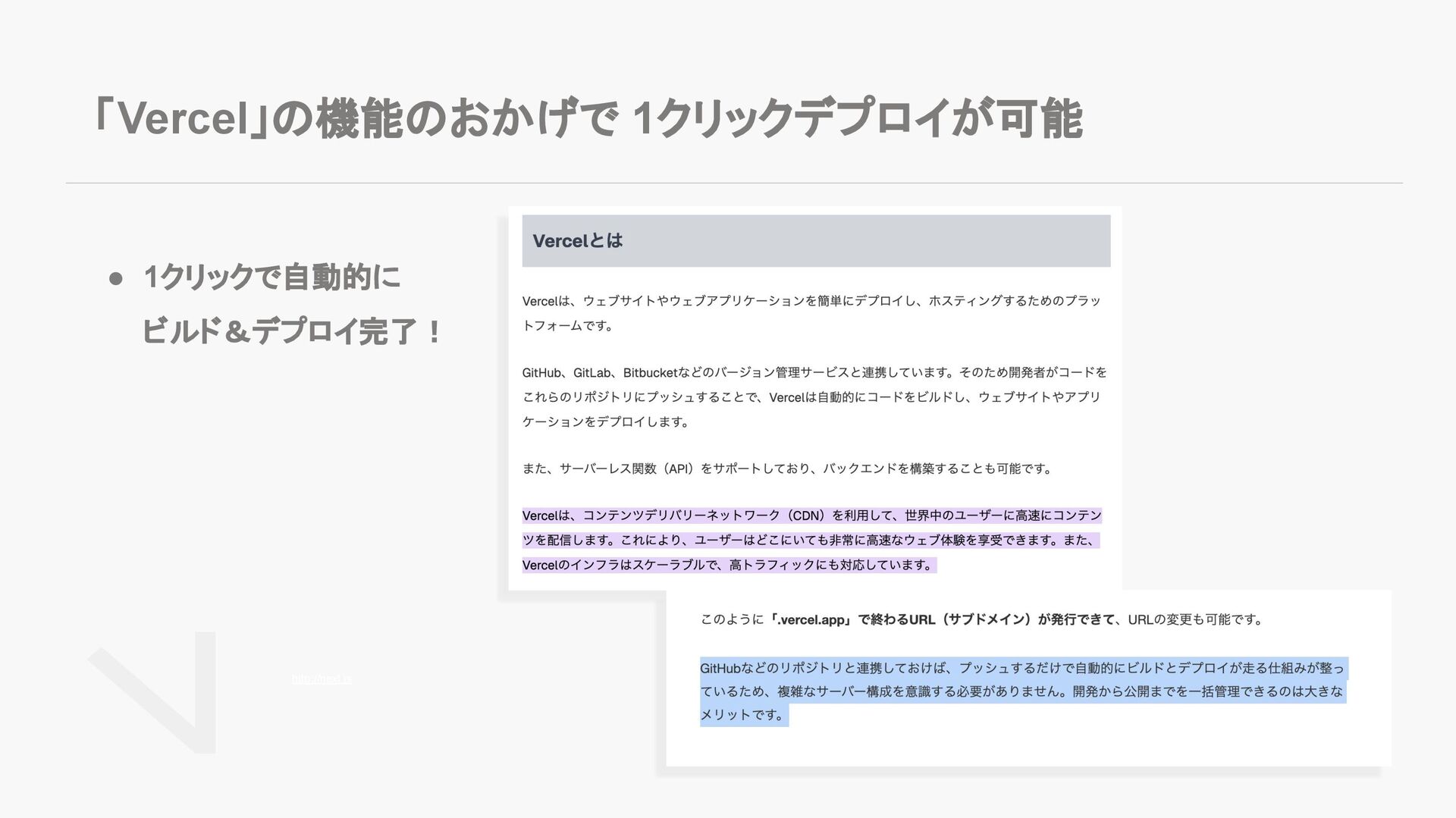 • 1クリックで自動的に ビルド&デプロイ完了! 「Vercel」の機能のおかげで 1クリックデプロイが可能 http://next.js