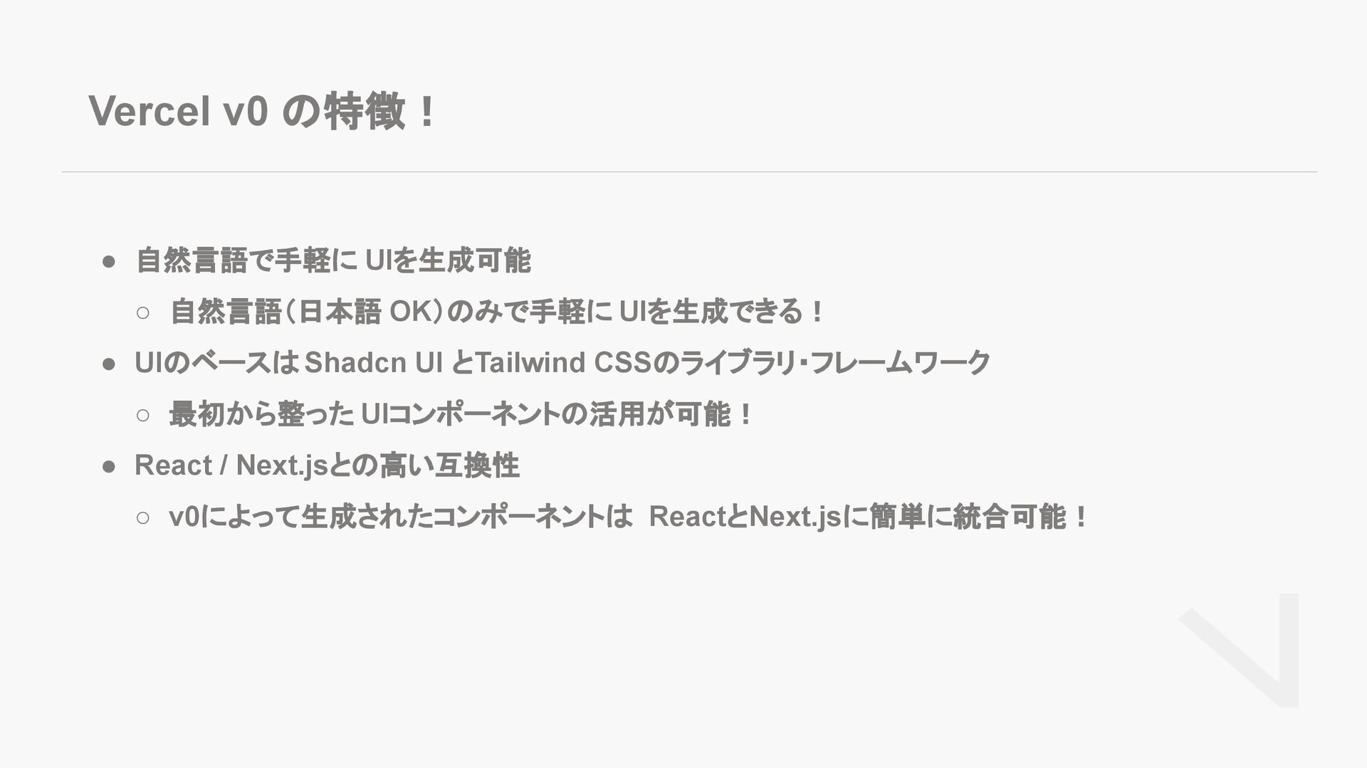 • UIのベースは Shadcn UI とTailwind CSSのライブラリ・フレームワーク ◦ 最初から整った UIコンポーネントの活用が可能! • React / Next.jsとの高い互換性 ◦ v0によって生成されたコンポーネントは ReactとNext.jsに簡単に統合可能!