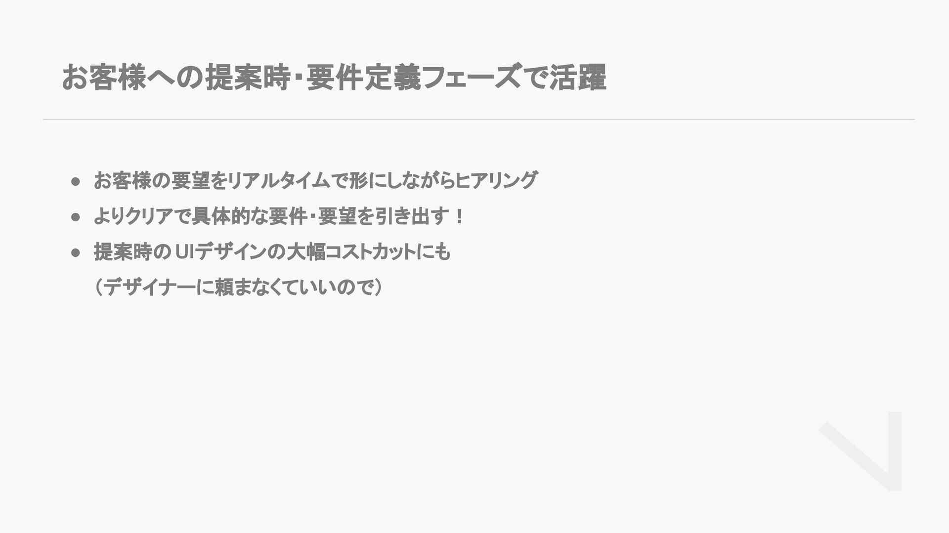 お客様への提案時・要件定義フェーズで活躍 • お客様の要望をリアルタイムで形にしながらヒアリング • よりクリアで具体的な要件・要望を引き出す! • 提案時のUIデザインの大幅コストカットにも (デザイナーに頼まなくていいので)