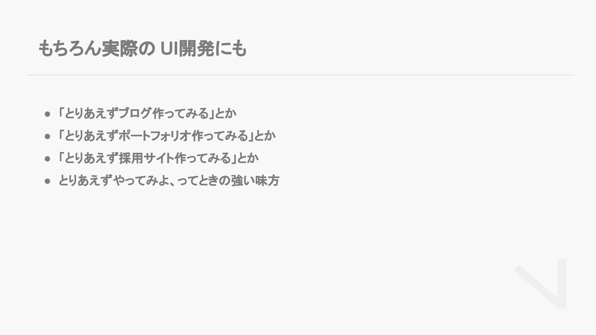 もちろん実際の UI開発にも • 「とりあえずブログ作ってみる」とか • 「とりあえずポートフォリオ作ってみる」とか • 「とりあえず採用サイト作ってみる」とか • とりあえずやってみよ、ってときの強い味方