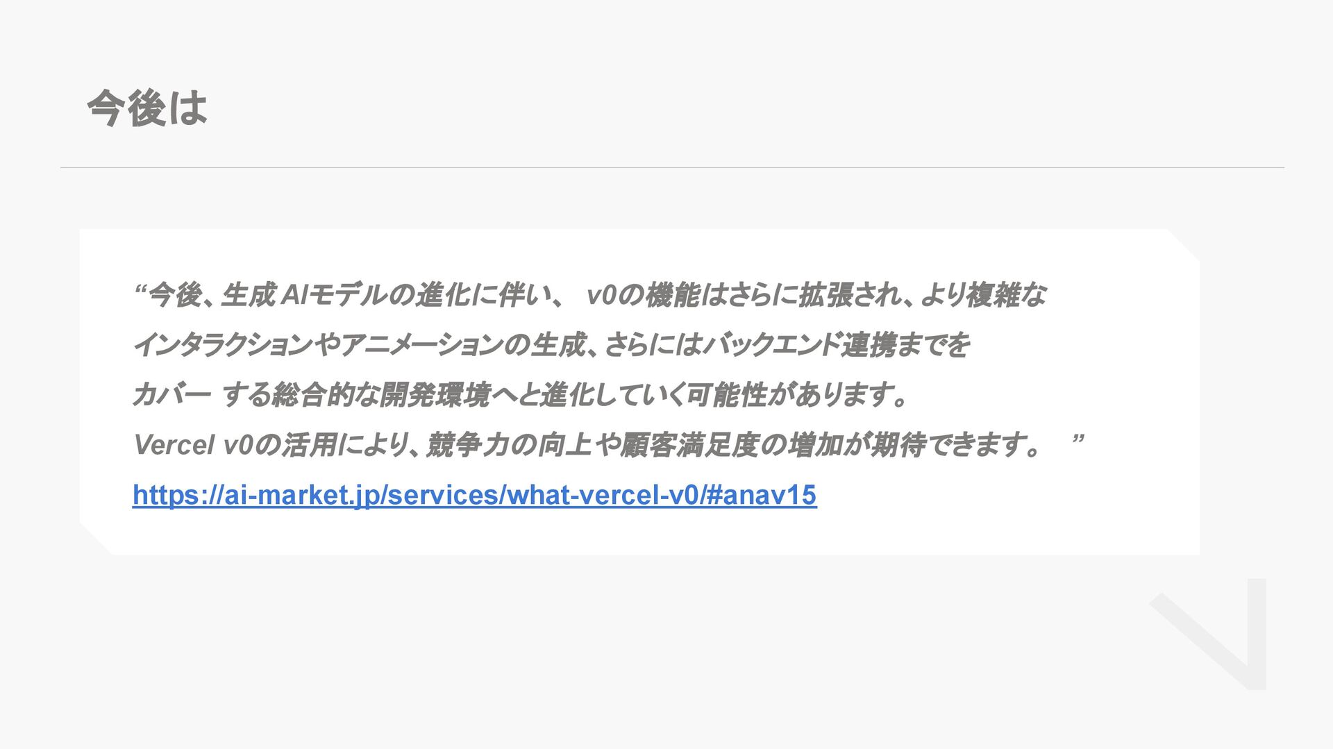 今後は “今後、生成 AIモデルの進化に伴い、 v0の機能はさらに拡張され、より複雑な インタラクションやアニメーションの生成、さらにはバックエンド連携までを カバー する総合的な開発環境へと進化していく可能性があります。 Vercel v0の活用により、競争力の向上や顧客満足度の増加が期待できます。 ”
