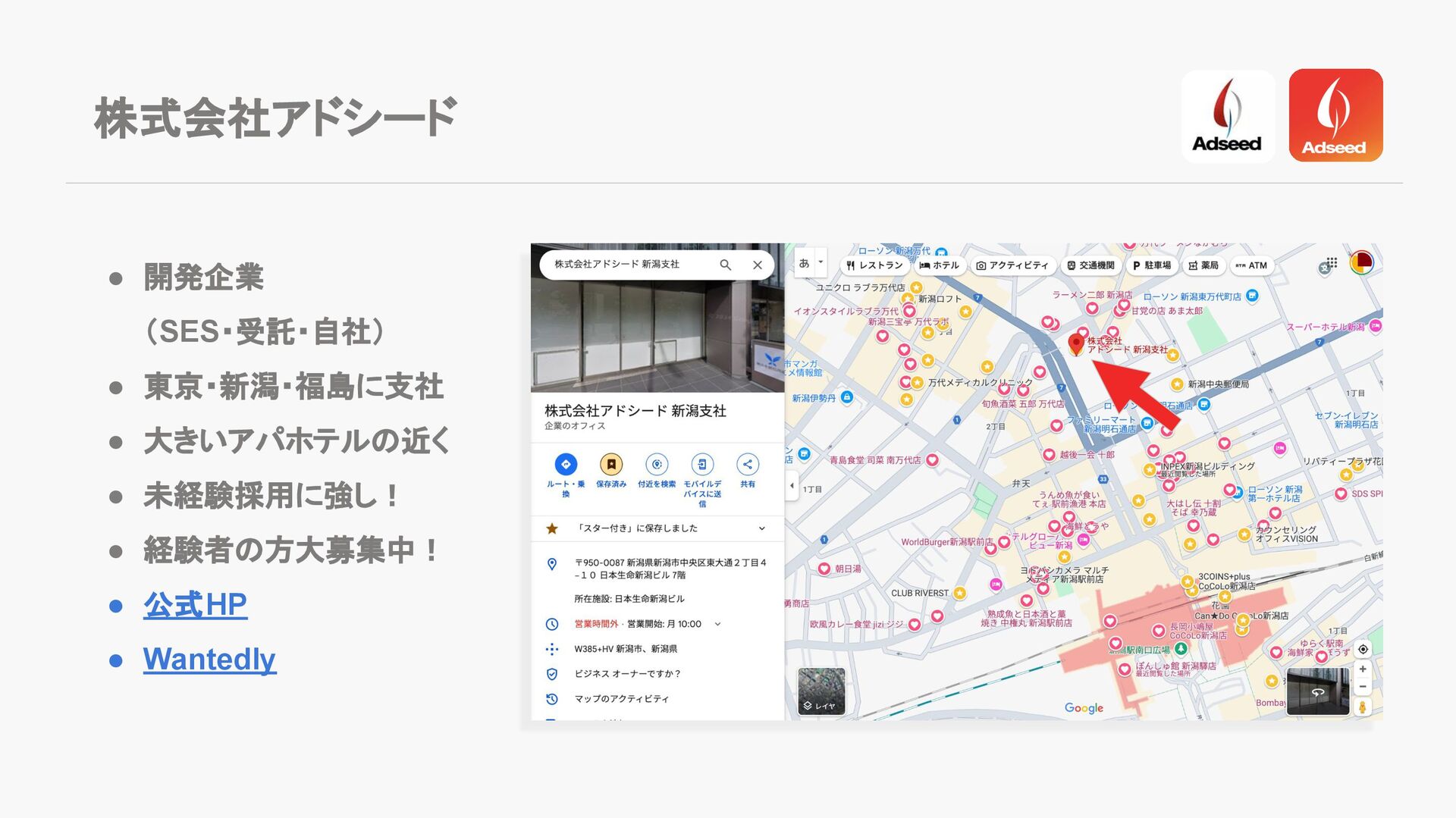 株式会社アドシード • 開発企業 (SES・受託・自社) • 東京・新潟・福島に支社 • 大きいアパホテルの近く • 未経験採用に強し!