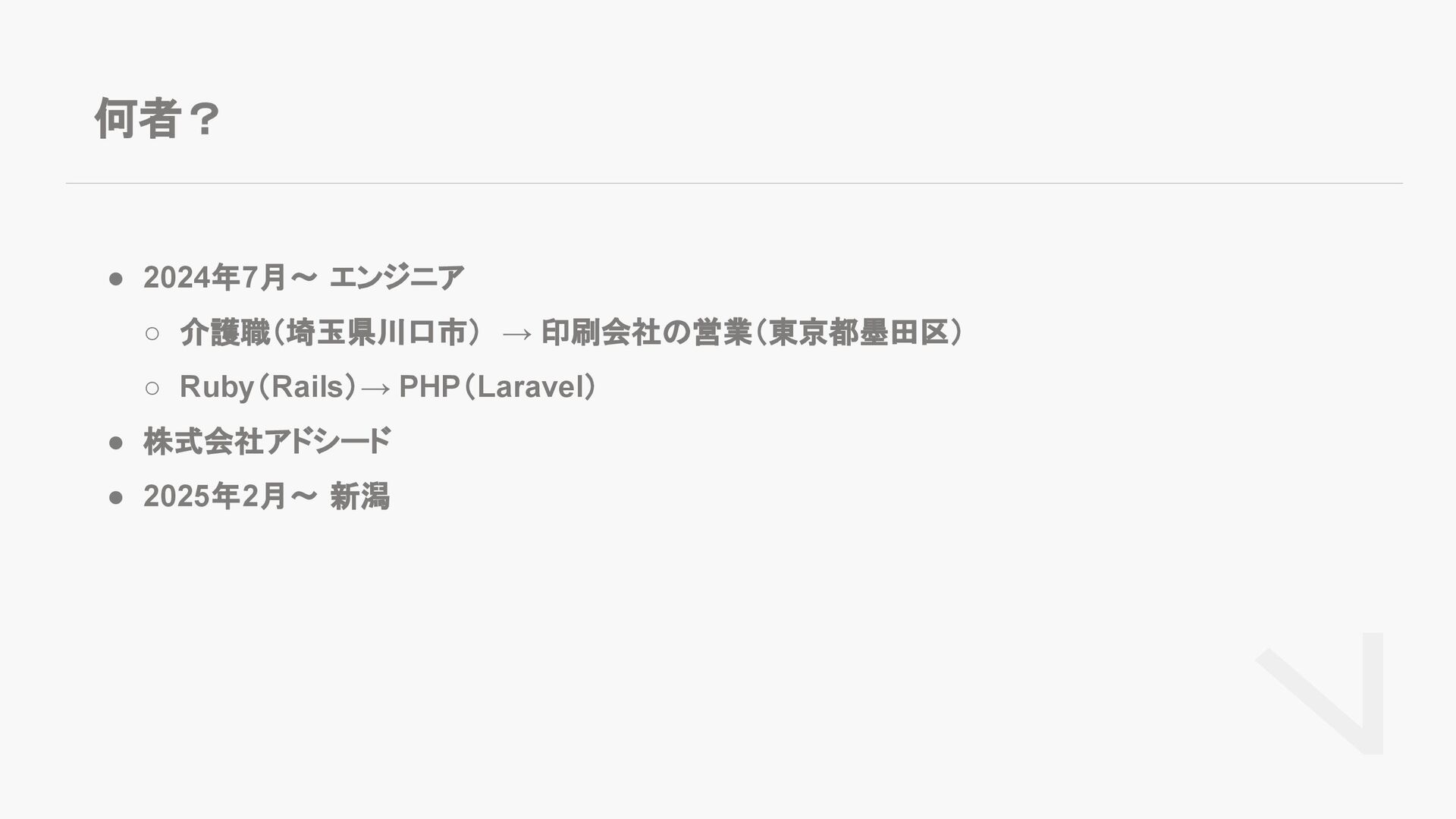 何者? • 2024年7月〜 エンジニア ◦ 介護職(埼玉県川口市) → 印刷会社の営業(東京都墨田区) ◦ Ruby(Rails)→