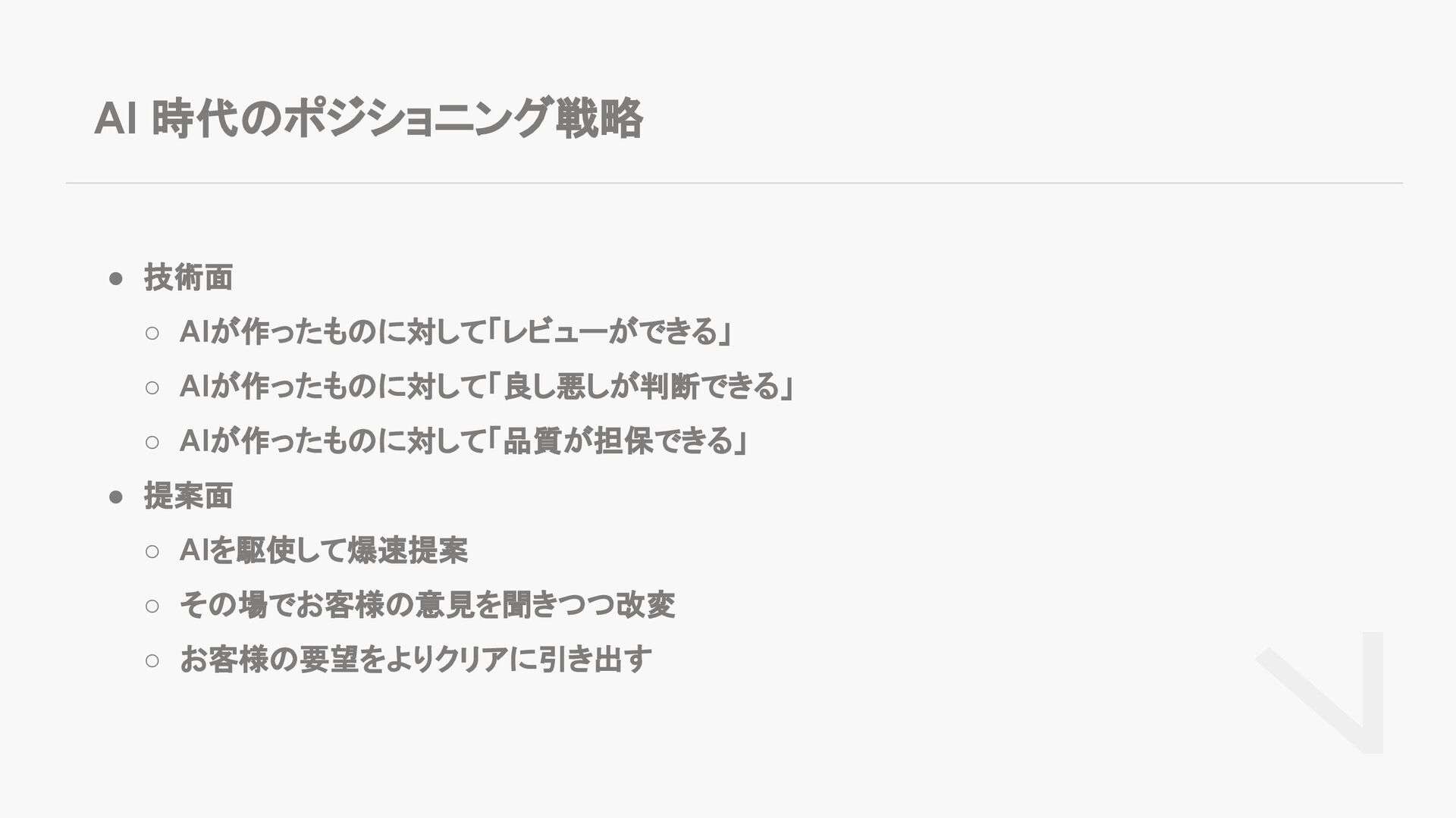 ◦ AIを駆使して爆速提案 ◦ その場でお客様の意見を聞きつつ改変 ◦ お客様の要望をよりクリアに引き出す AI 時代のポジショニング戦略
