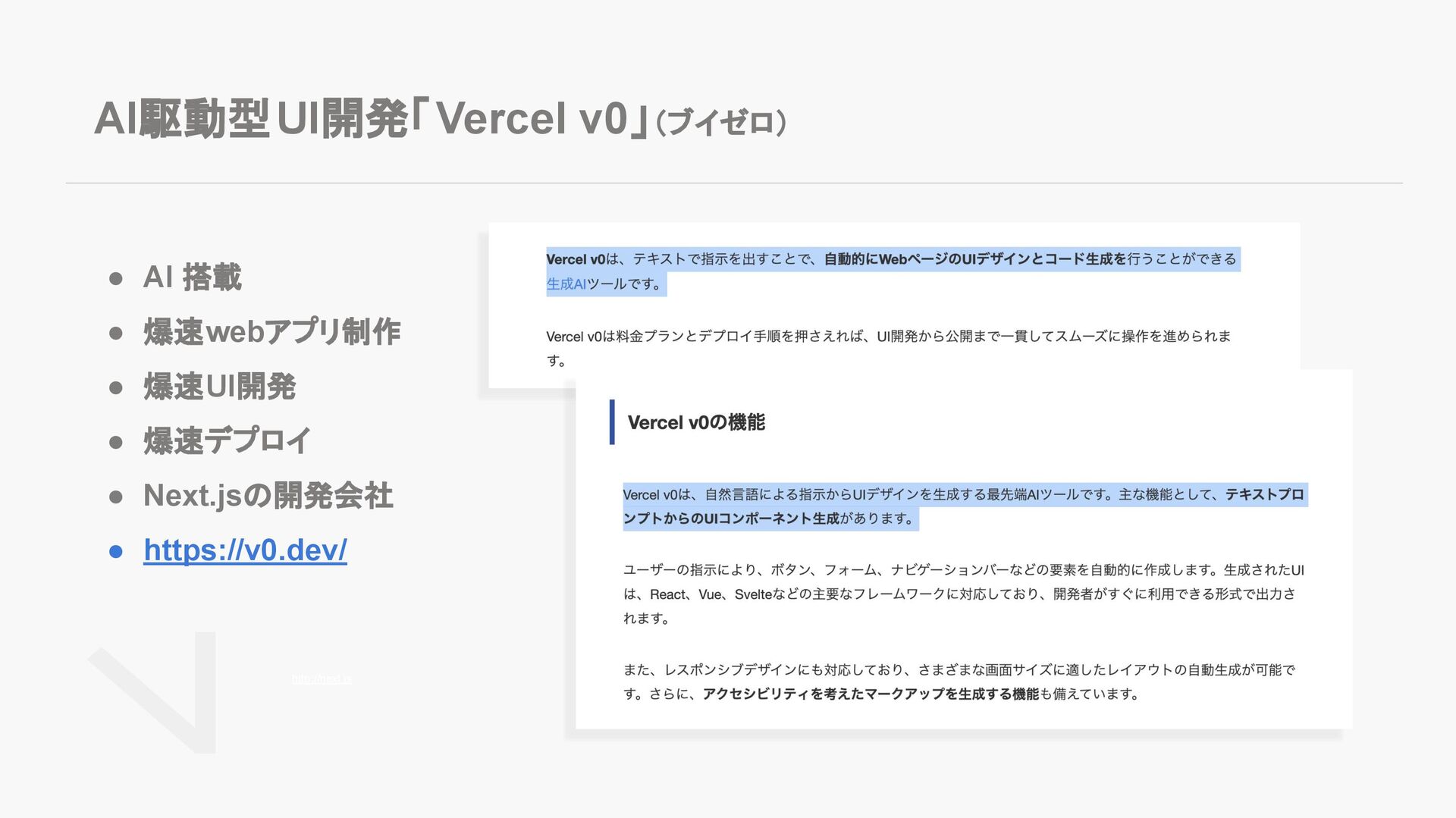 Next.jsの開発会社 • https://v0.dev/ AI駆動型UI開発「Vercel v0」(ブイゼロ) http://next.js