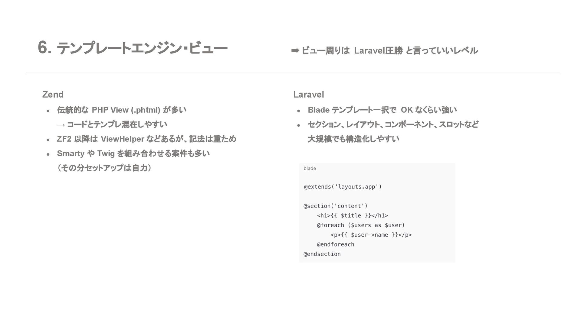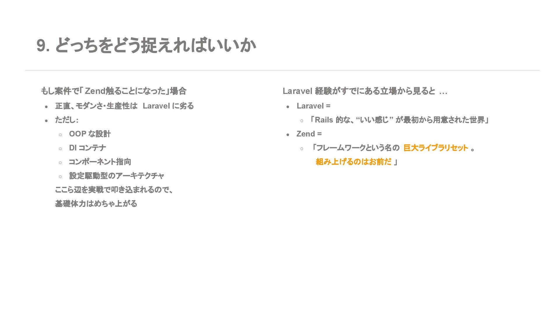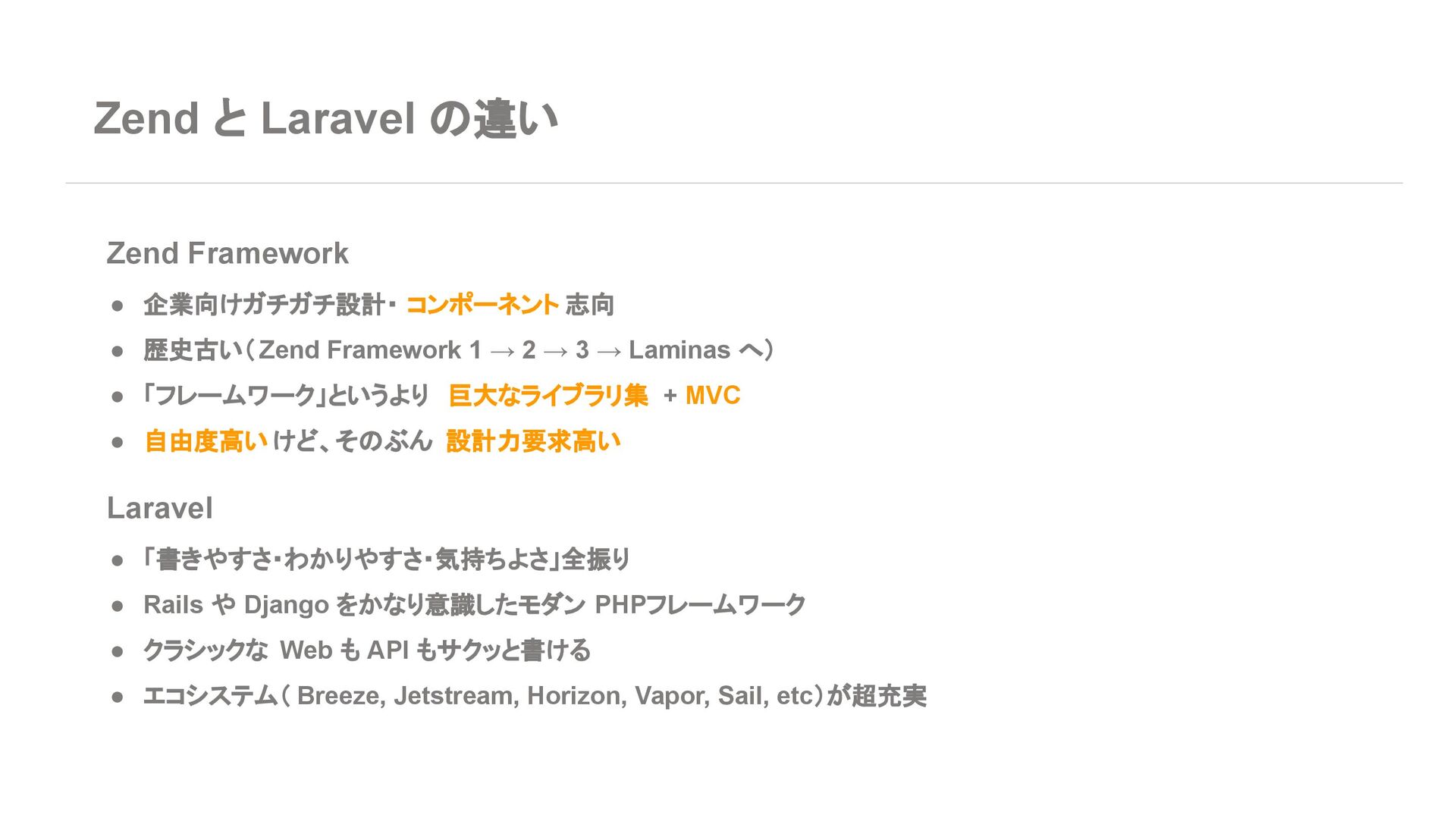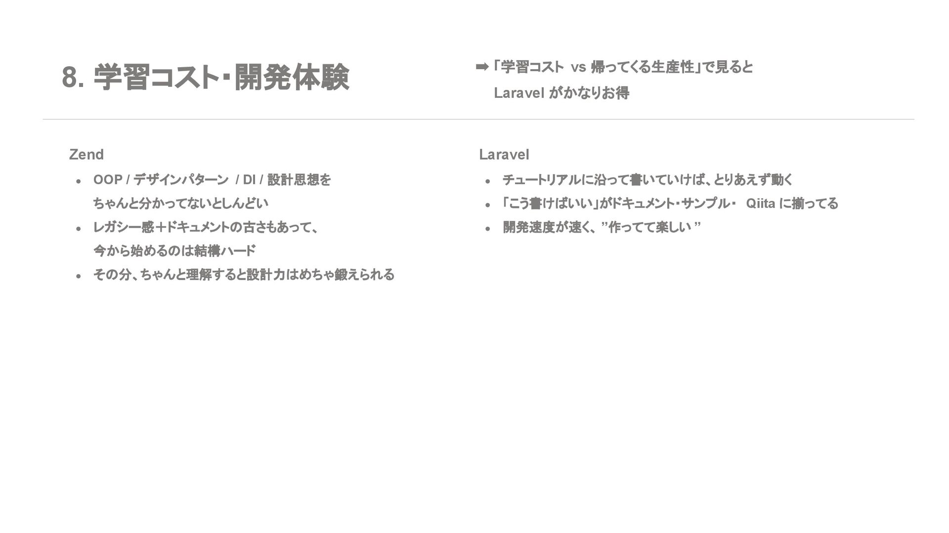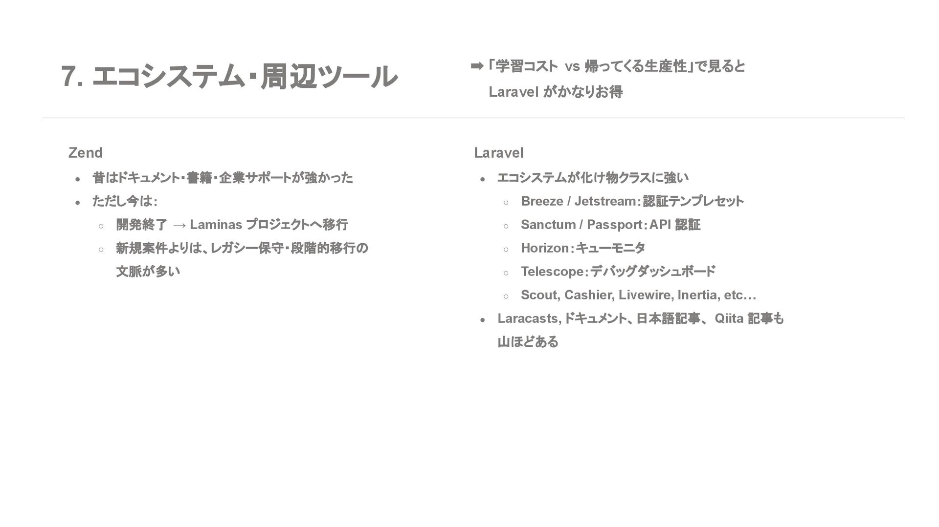 ◦ 新規案件よりは、レガシー保守・段階的移行の 文脈が多い 7. エコシステム・周辺ツール Laravel • エコシステムが化け物クラスに強い ◦ Breeze / Jetstream:認証テンプレセット ◦ Sanctum / Passport:API 認証 ◦ Horizon:キューモニタ ◦ Telescope:デバッグダッシュボード ◦ Scout, Cashier, Livewire, Inertia, etc… • Laracasts, ドキュメント、日本語記事、 Qiita 記事も 山ほどある ➡ 「学習コスト vs 帰ってくる生産性」で見ると Laravel がかなりお得