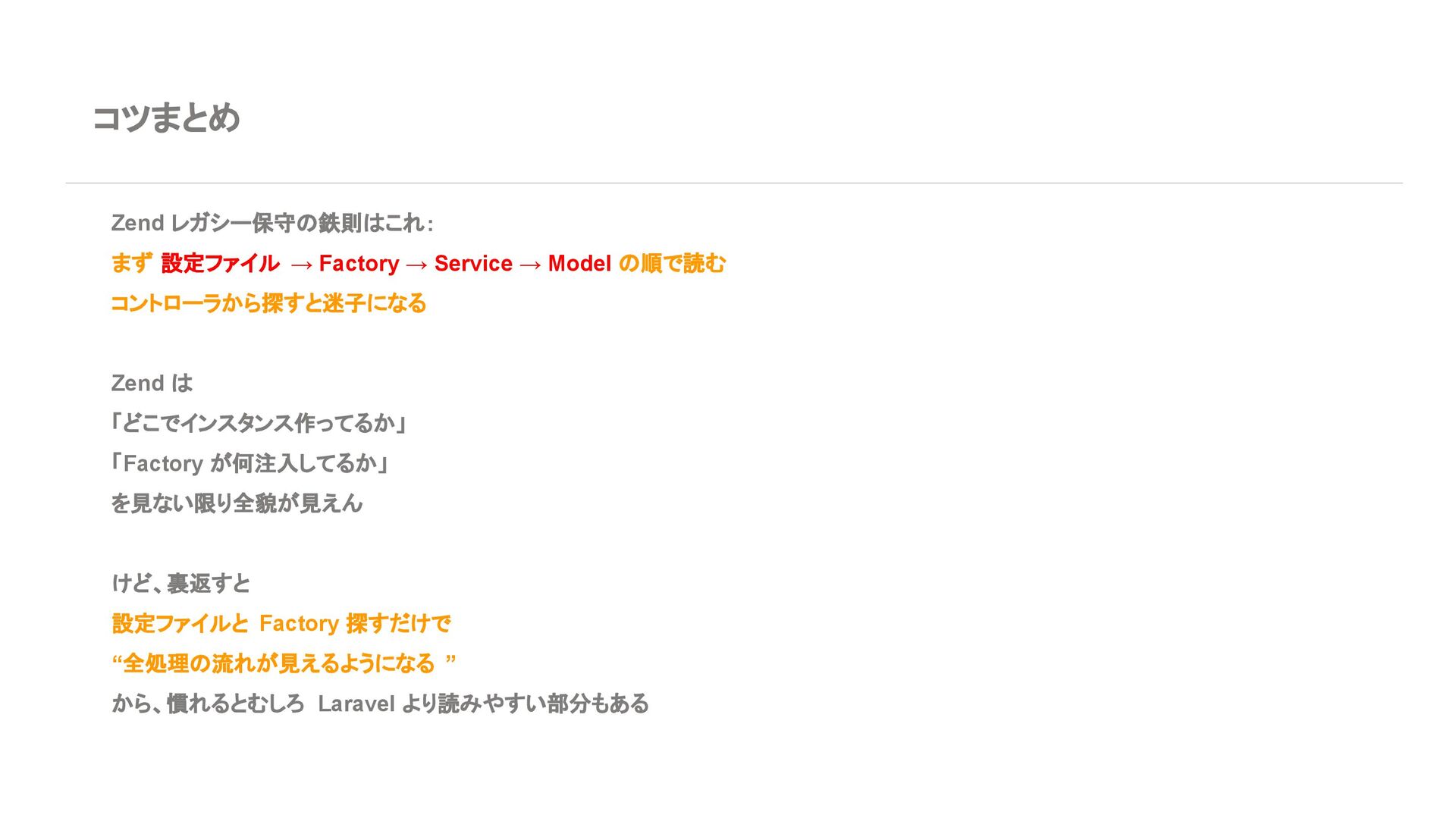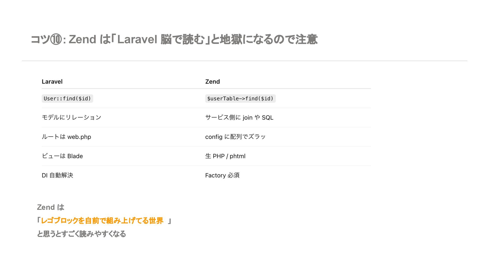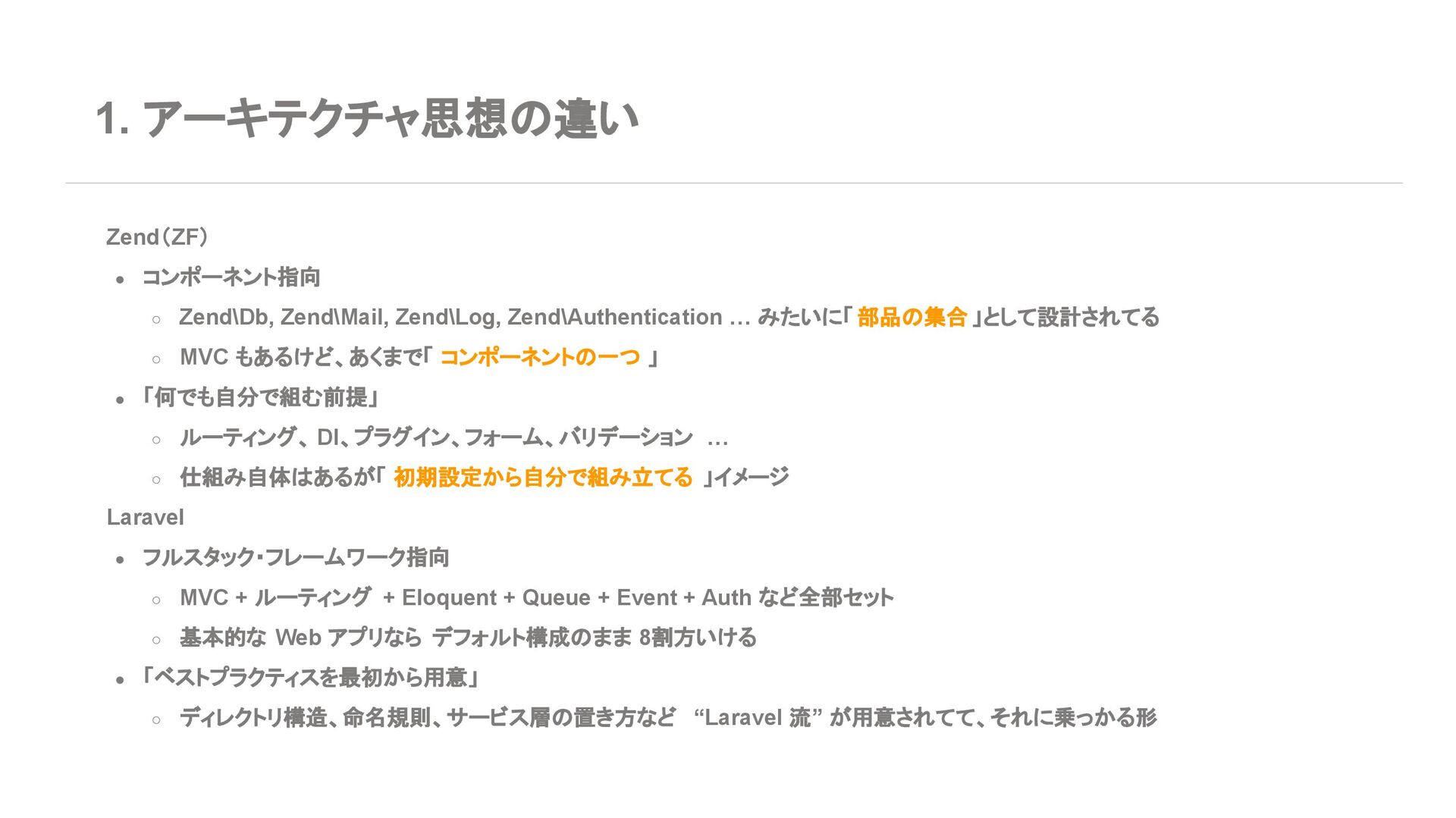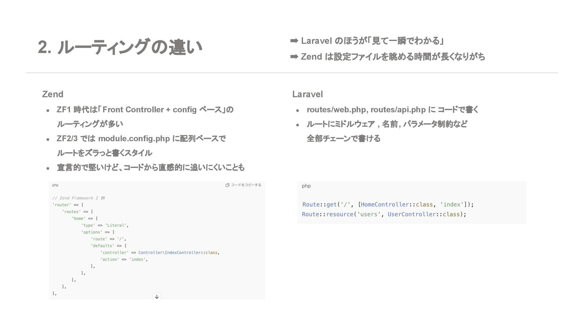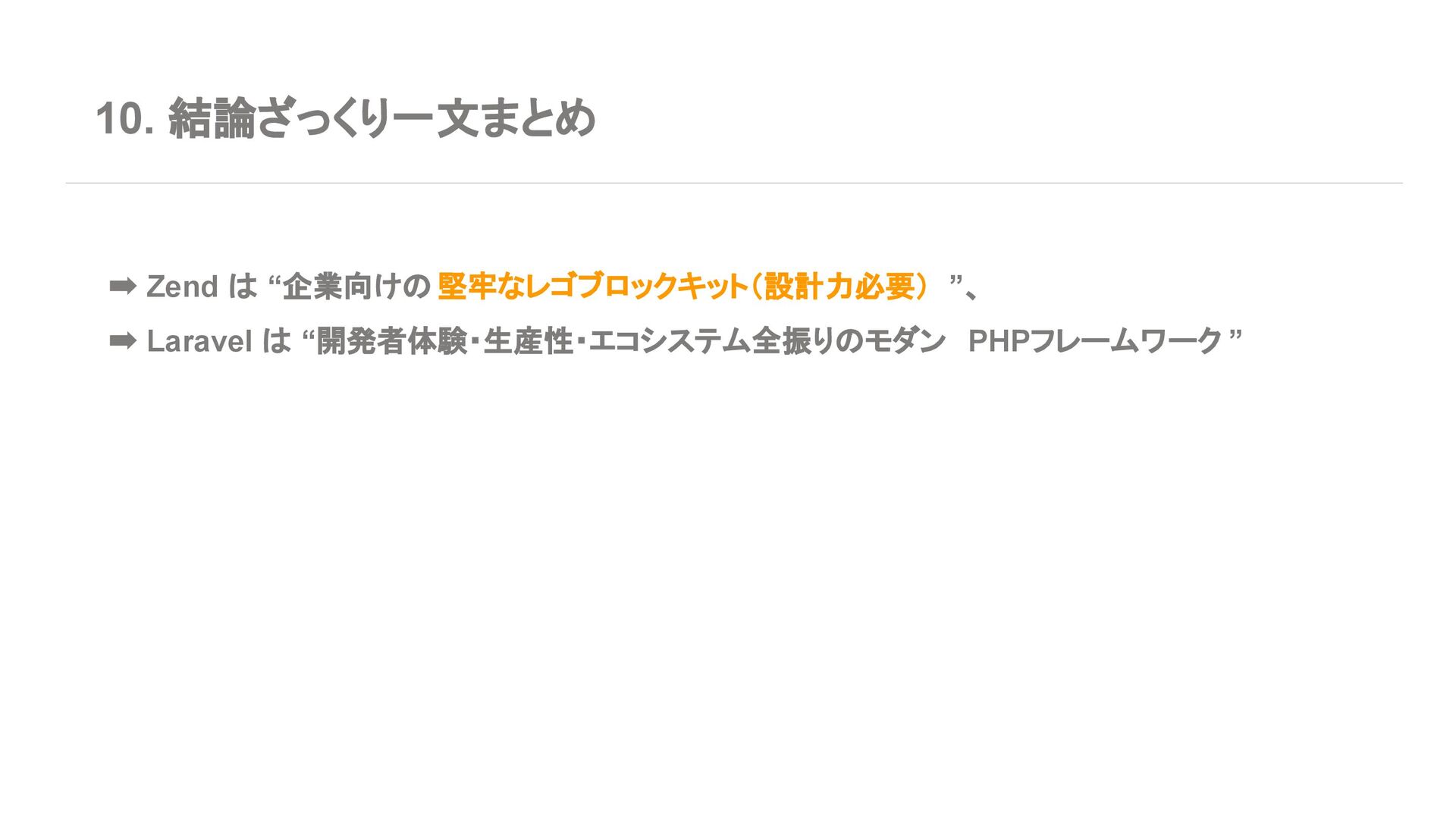 ◦ 新規案件よりは、レガシー保守・段階的移行の 文脈が多い 7. エコシステム・周辺ツール Laravel • エコシステムが化け物クラスに強い ◦ Breeze / Jetstream:認証テンプレセット ◦ Sanctum / Passport:API 認証 ◦ Horizon:キューモニタ ◦ Telescope:デバッグダッシュボード ◦ Scout, Cashier, Livewire, Inertia, etc… • Laracasts, ドキュメント、日本語記事、 Qiita 記事も 山ほどある ➡ 「学習コスト vs 帰ってくる生産性」で見ると Laravel がかなりお得