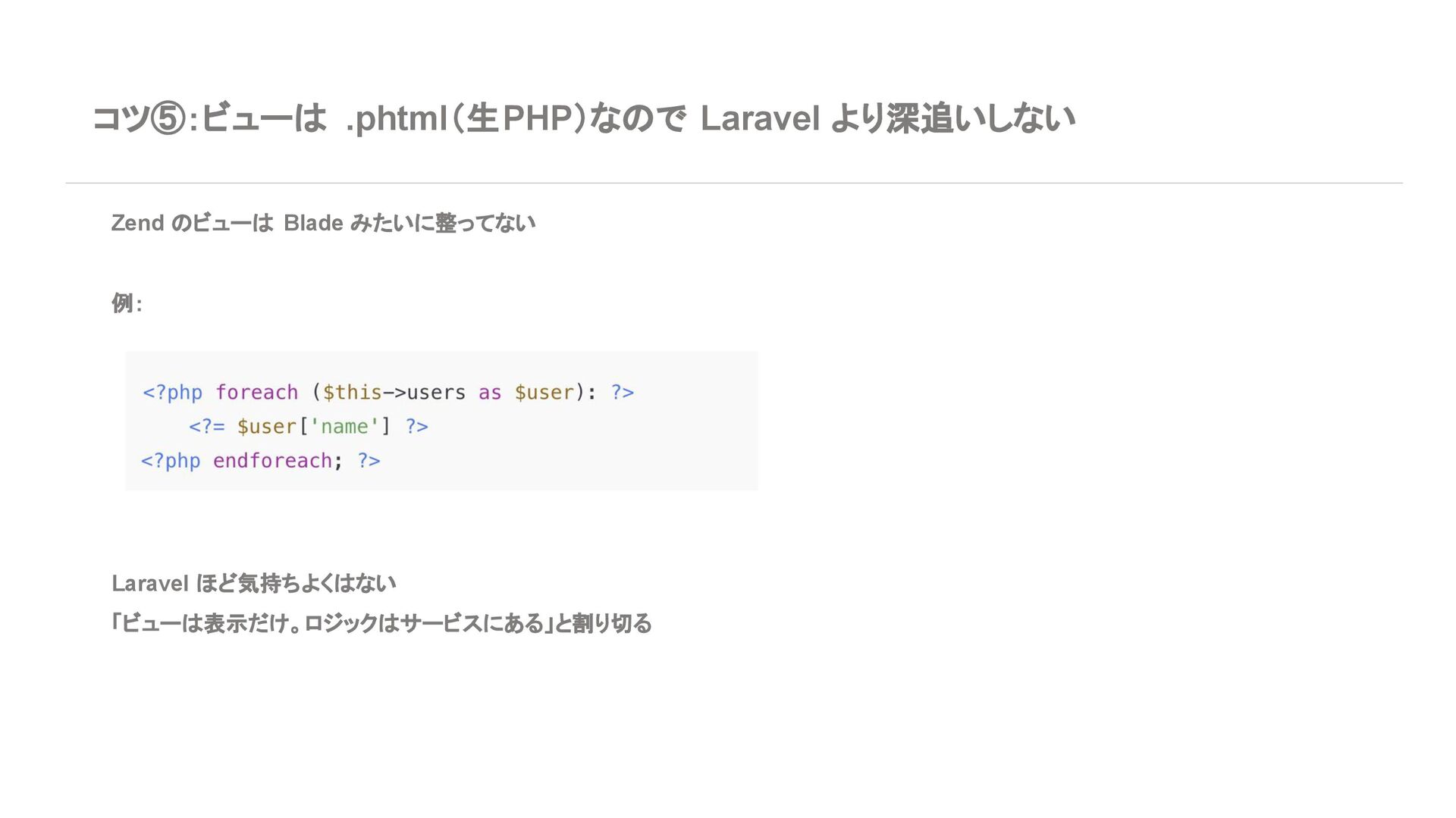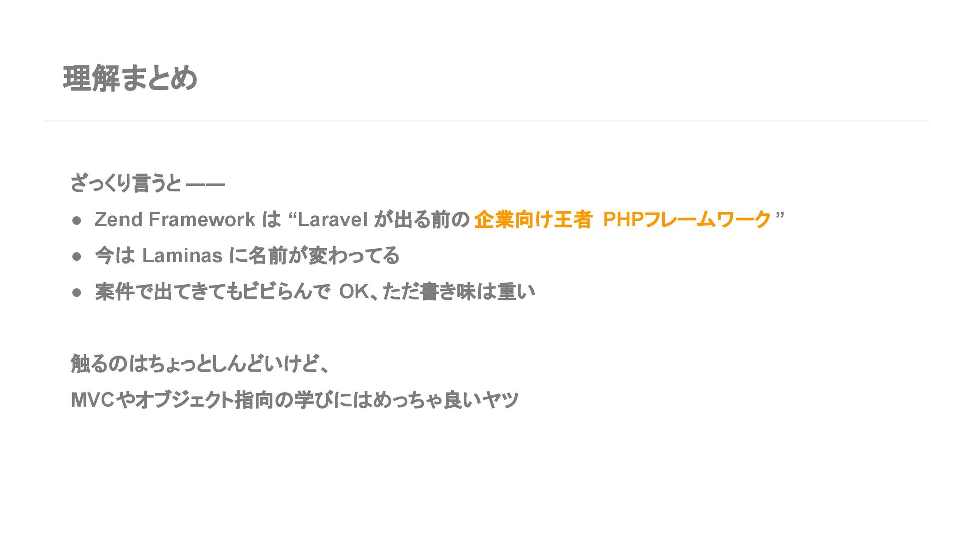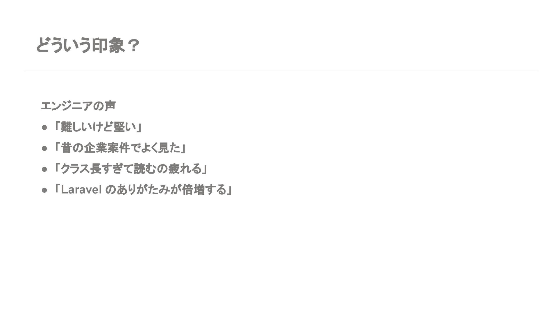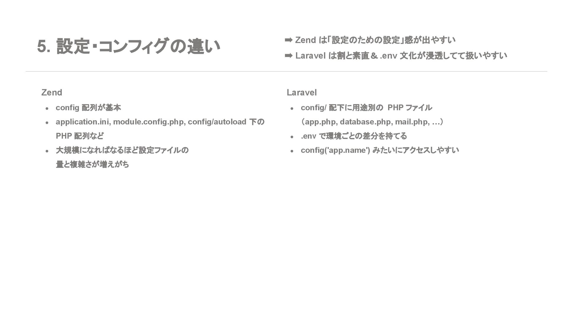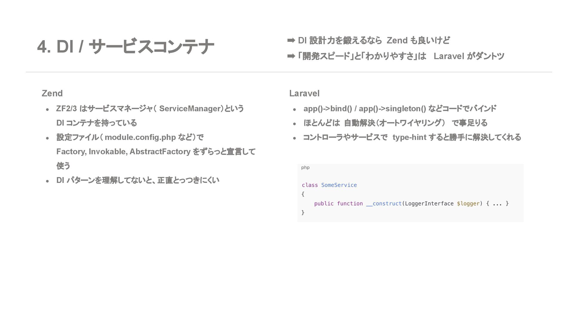 ◦ 新規案件よりは、レガシー保守・段階的移行の 文脈が多い 7. エコシステム・周辺ツール Laravel • エコシステムが化け物クラスに強い ◦ Breeze / Jetstream:認証テンプレセット ◦ Sanctum / Passport:API 認証 ◦ Horizon:キューモニタ ◦ Telescope:デバッグダッシュボード ◦ Scout, Cashier, Livewire, Inertia, etc… • Laracasts, ドキュメント、日本語記事、 Qiita 記事も 山ほどある ➡ 「学習コスト vs 帰ってくる生産性」で見ると Laravel がかなりお得