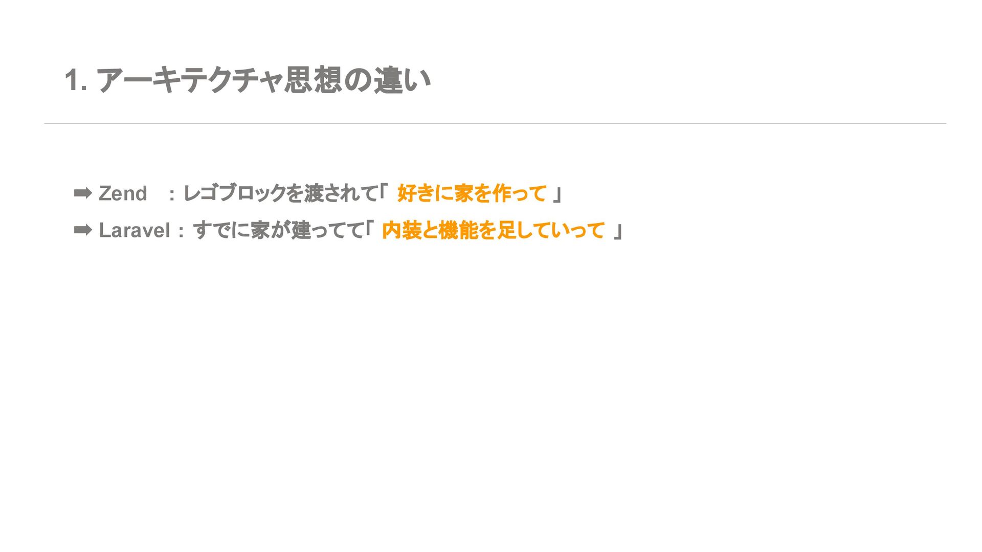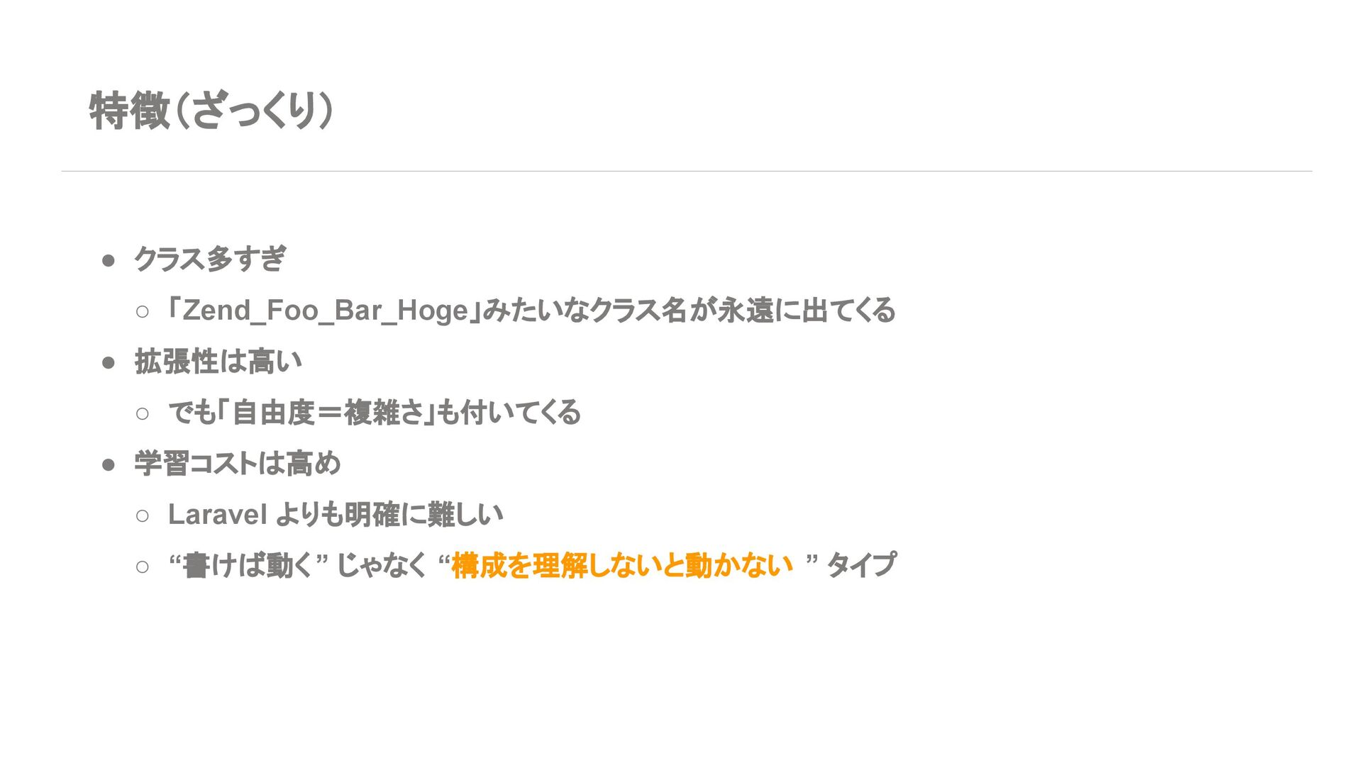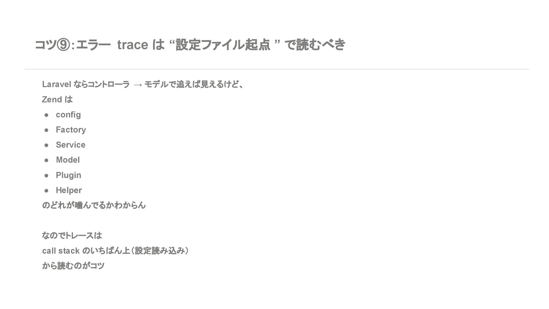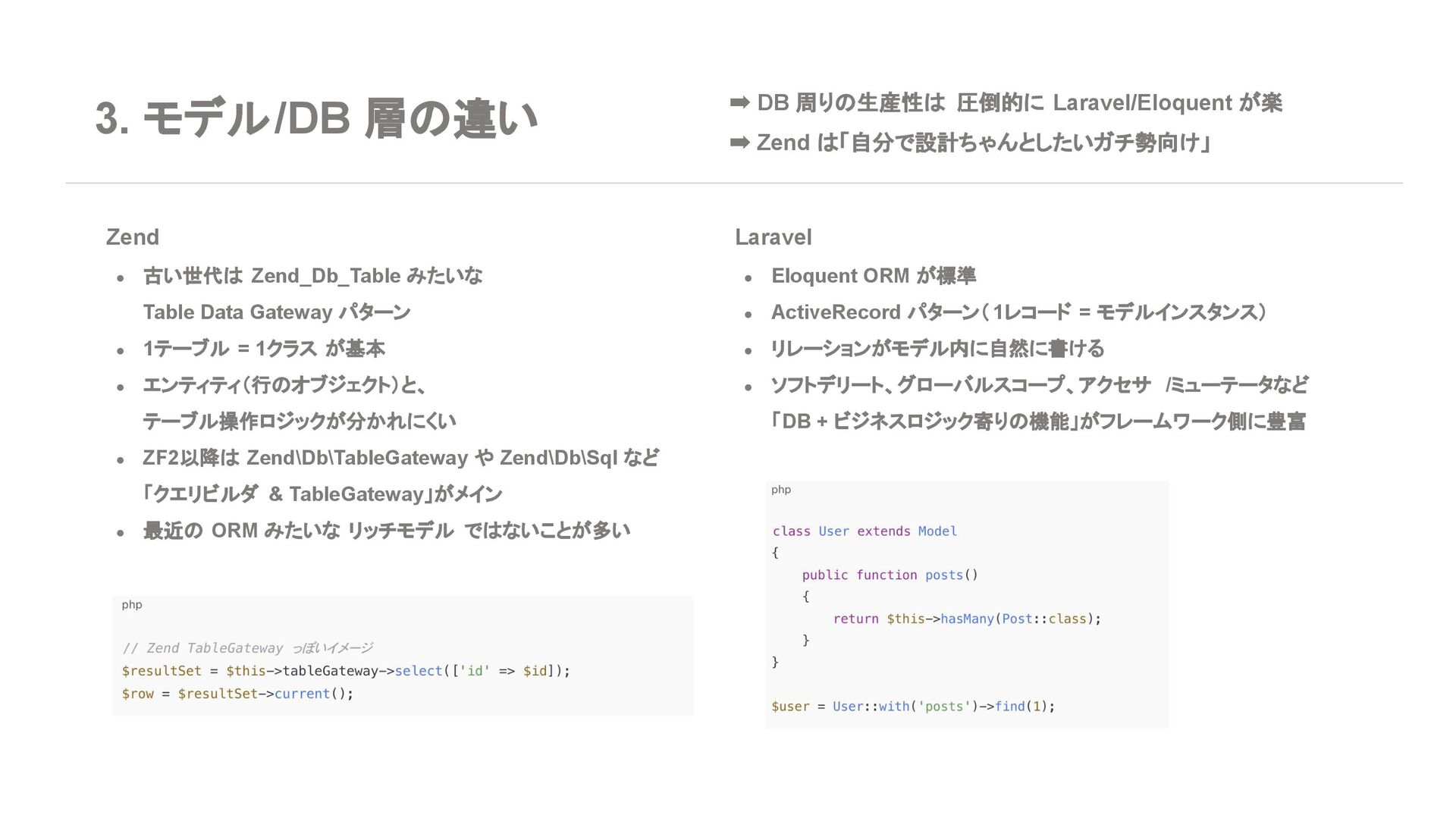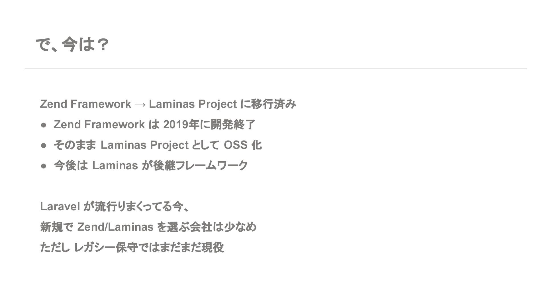 ◦ 新規案件よりは、レガシー保守・段階的移行の 文脈が多い 7. エコシステム・周辺ツール Laravel • エコシステムが化け物クラスに強い ◦ Breeze / Jetstream:認証テンプレセット ◦ Sanctum / Passport:API 認証 ◦ Horizon:キューモニタ ◦ Telescope:デバッグダッシュボード ◦ Scout, Cashier, Livewire, Inertia, etc… • Laracasts, ドキュメント、日本語記事、 Qiita 記事も 山ほどある ➡ 「学習コスト vs 帰ってくる生産性」で見ると Laravel がかなりお得