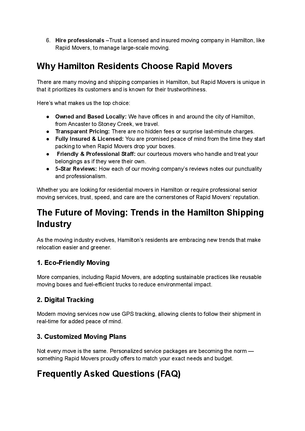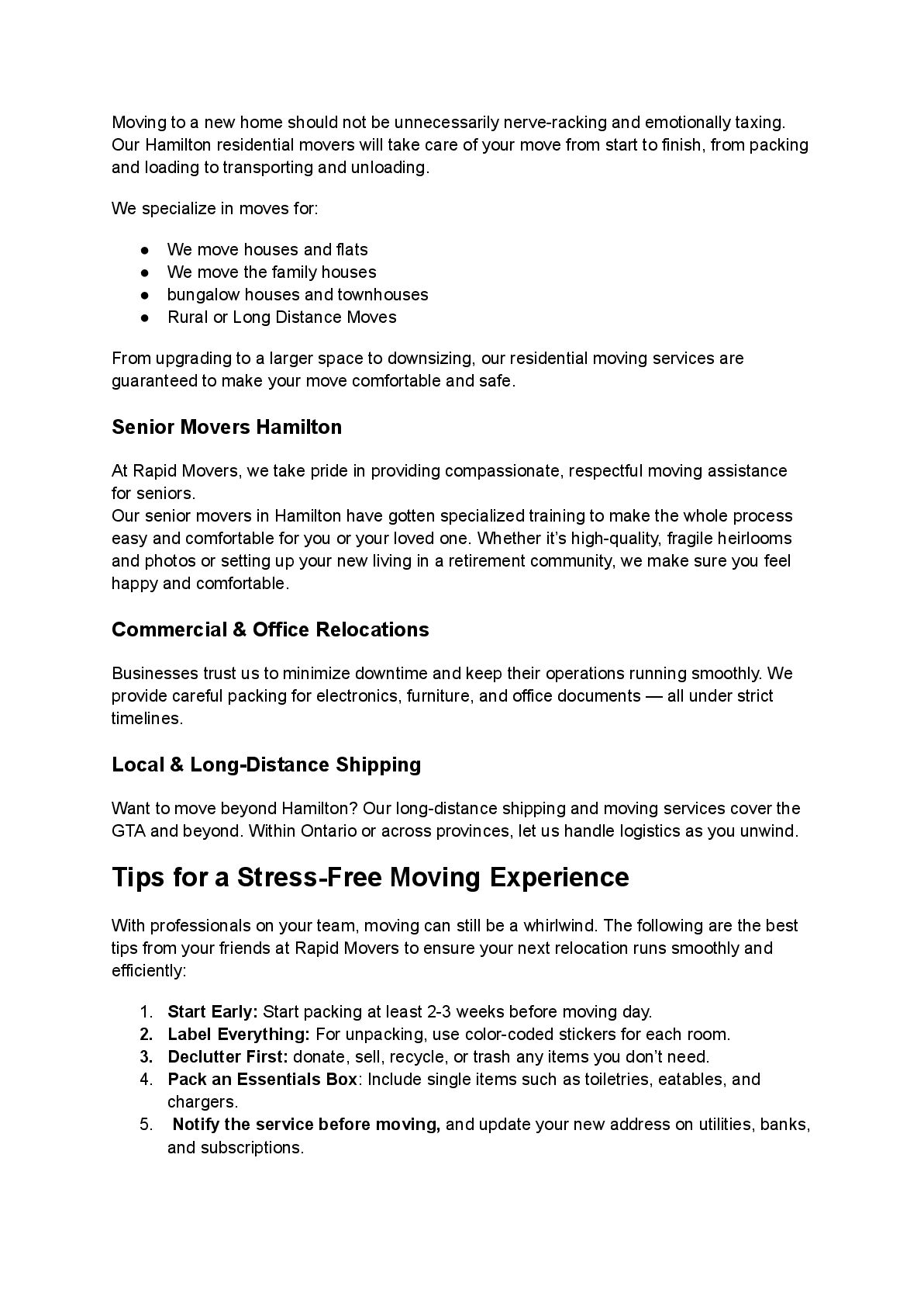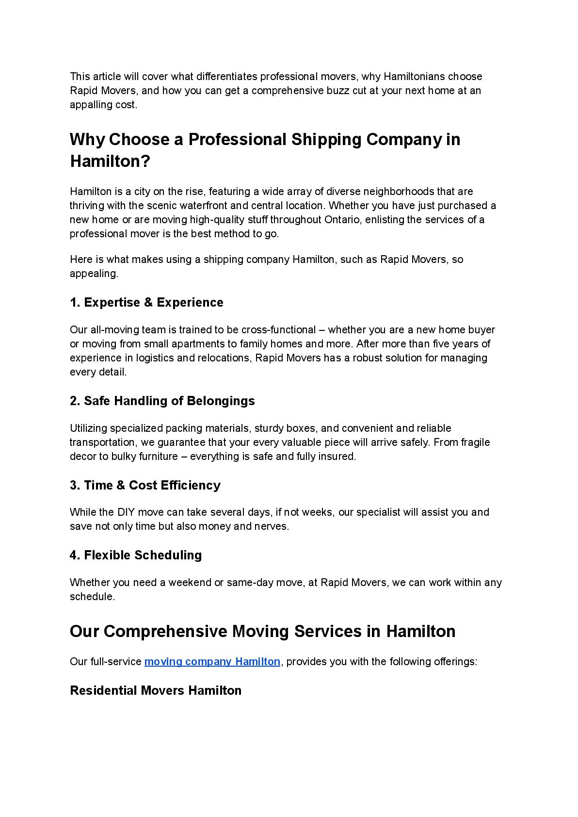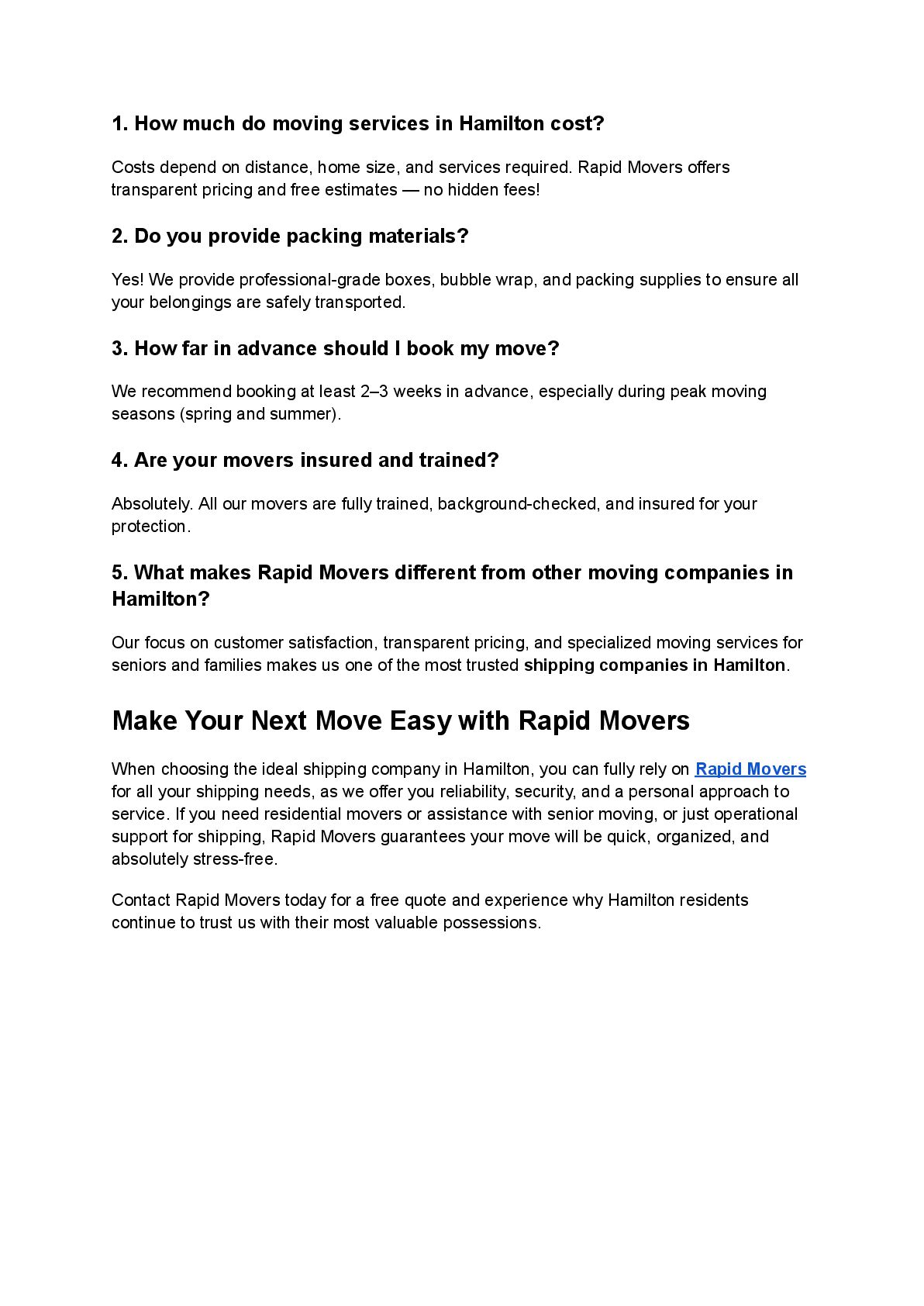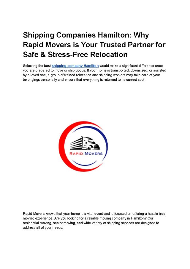 When it comes to reliable shipping companies in Hamilton, Rapid Movers stands out for delivering safe, efficient, and stress-free relocation services. With a skilled team, modern equipment, and a customer-focused approach, Rapid Movers ensures your belongings are handled with the utmost care from start to finish. Whether you’re moving locally or long-distance, residential or commercial, we provide tailored solutions, secure transport, and timely delivery to make your relocation smooth and worry-free. Trust Rapid Movers for professional service, transparent pricing, and complete peace of mind.