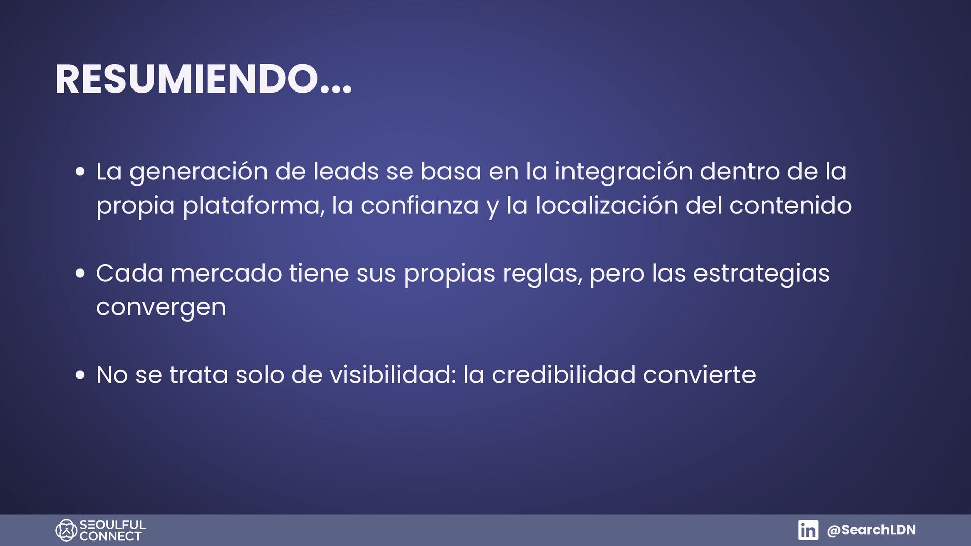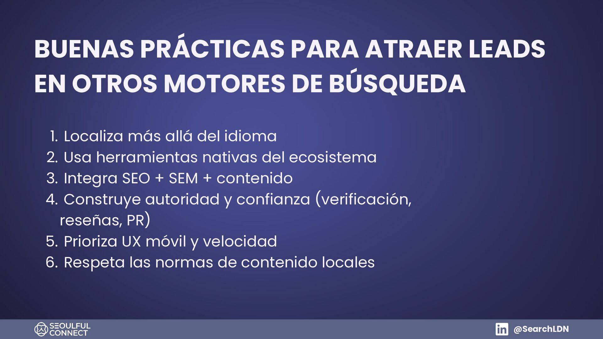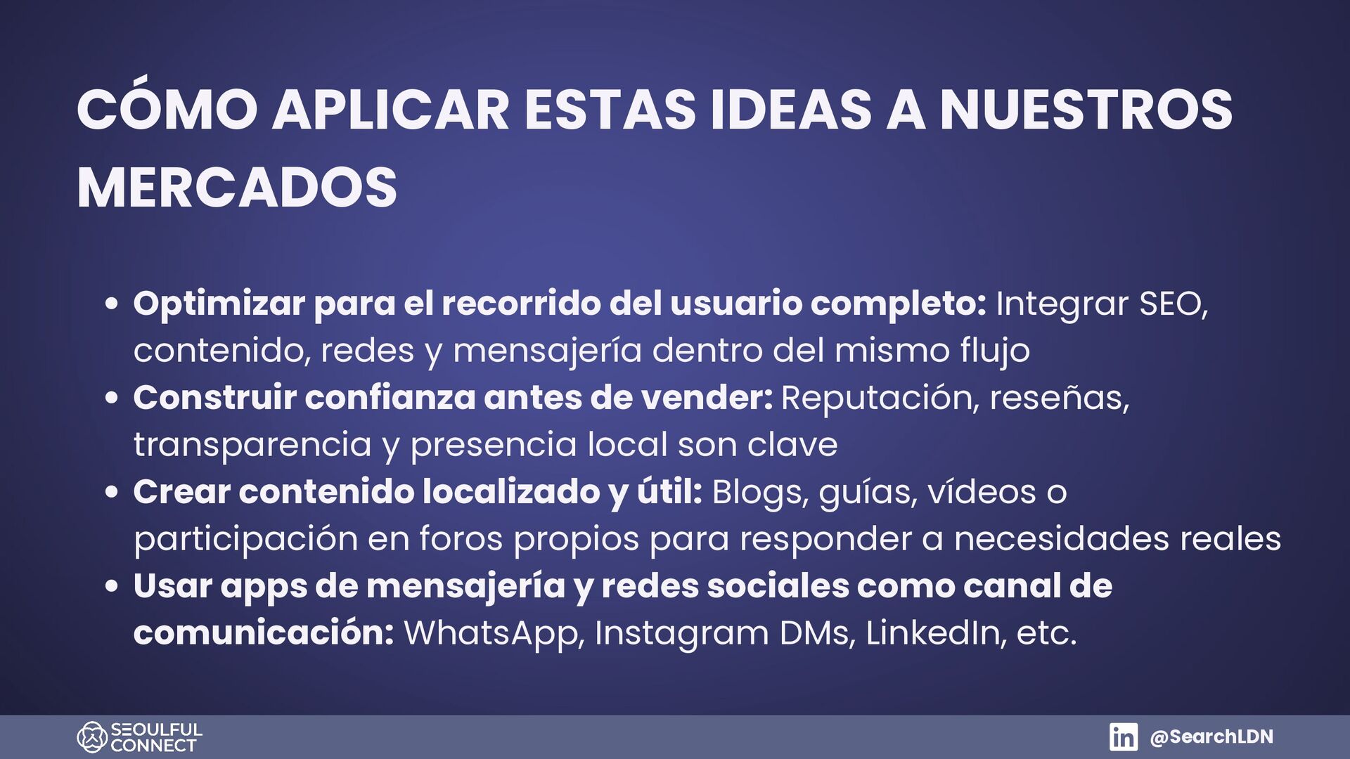 redes y mensajería dentro del mismo flujo Construir confianza antes de vender: Reputación, reseñas, transparencia y presencia local son clave Crear contenido localizado y útil: Blogs, guías, vídeos o participación en foros propios para responder a necesidades reales Usar apps de mensajería y redes sociales como canal de comunicación: WhatsApp, Instagram DMs, LinkedIn, etc. CÓMO APLICAR ESTAS IDEAS A NUESTROS MERCADOS @SearchLDN