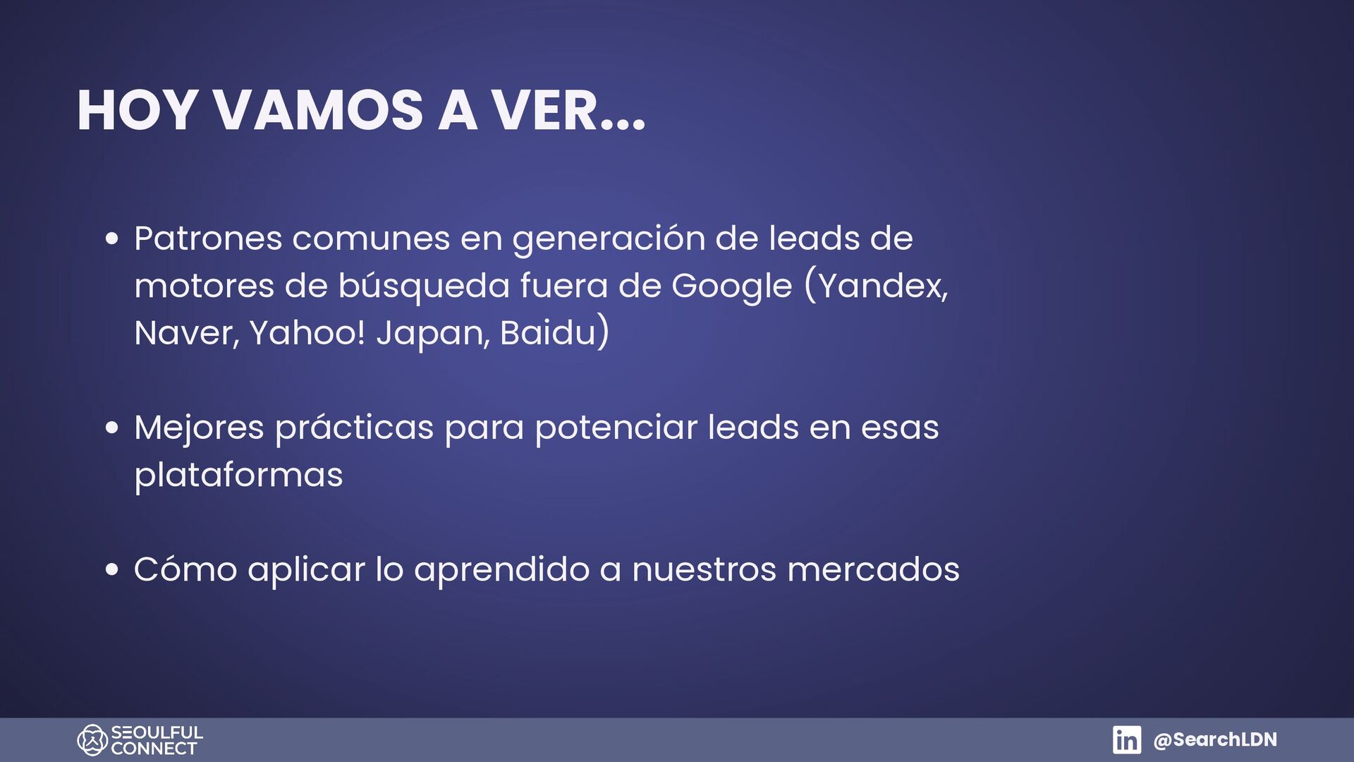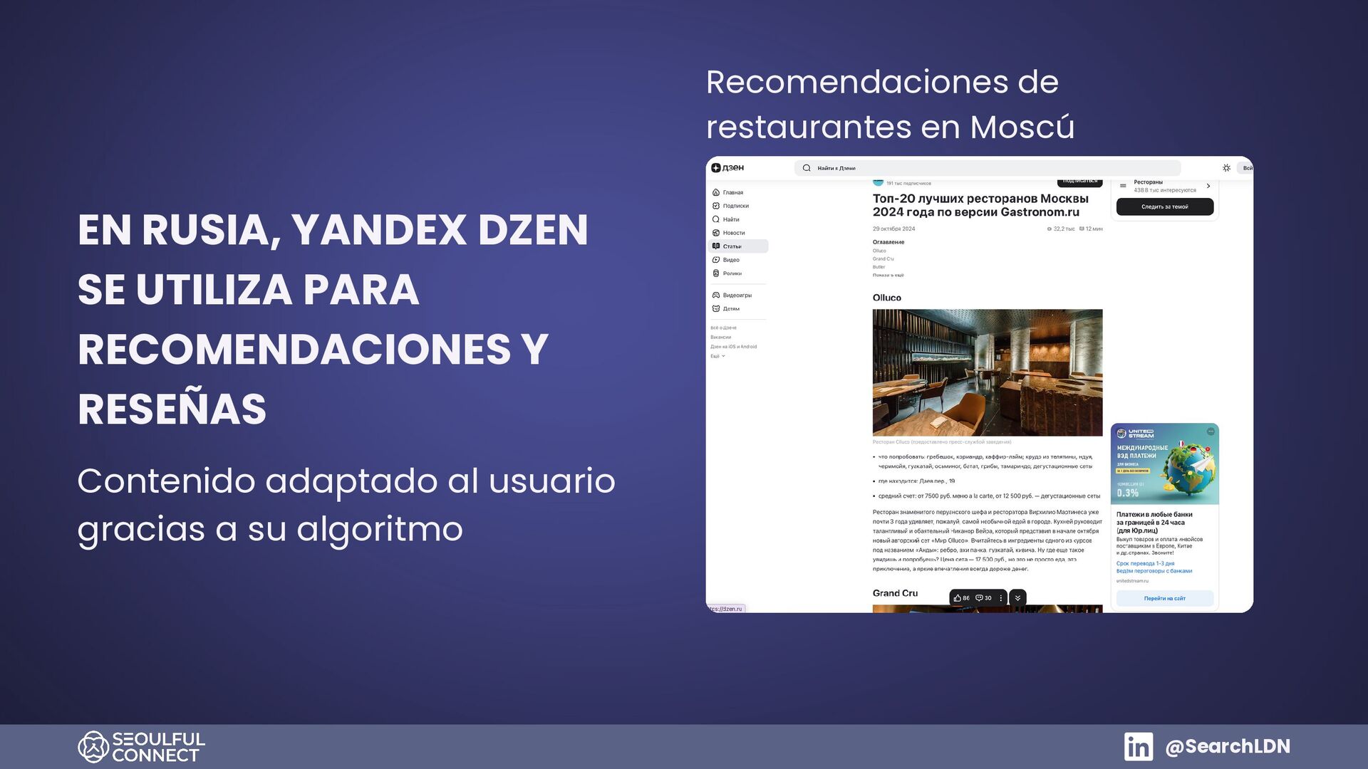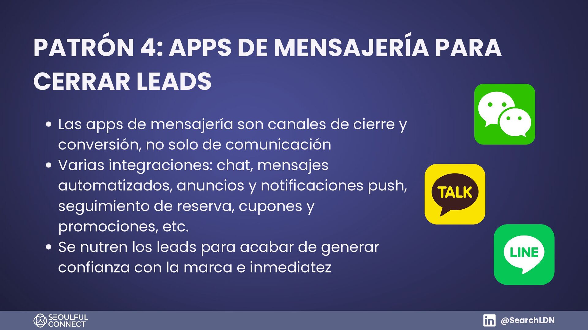 redes y mensajería dentro del mismo flujo Construir confianza antes de vender: Reputación, reseñas, transparencia y presencia local son clave Crear contenido localizado y útil: Blogs, guías, vídeos o participación en foros propios para responder a necesidades reales Usar apps de mensajería y redes sociales como canal de comunicación: WhatsApp, Instagram DMs, LinkedIn, etc. CÓMO APLICAR ESTAS IDEAS A NUESTROS MERCADOS @SearchLDN