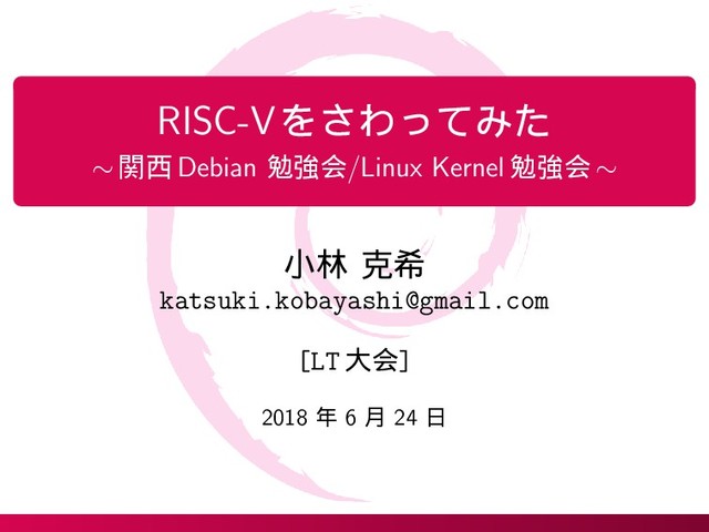 2018-06-24 関西Debian勉強会+LinuxKernel勉強会 のLT大会ではなした内容です。 RISC-Vの紹介と、Debianのriscv64ポーティングをQEMUで動かしてみた、的な内容です。