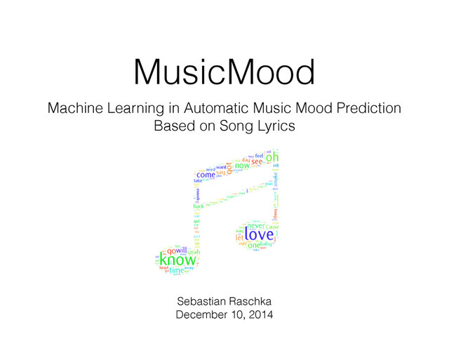 This project is about building a music recommendation system for users who want to listen to happysongs. Such a system can not only be used to brighten up one's mood on a rainy weekend; especially in hospitals, other medical clinics, or public locations such as restaurants, the MusicMood classifier could be used to spread positive mood among people.