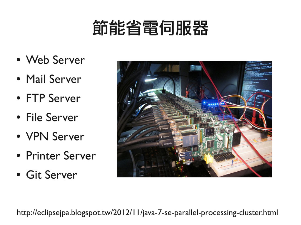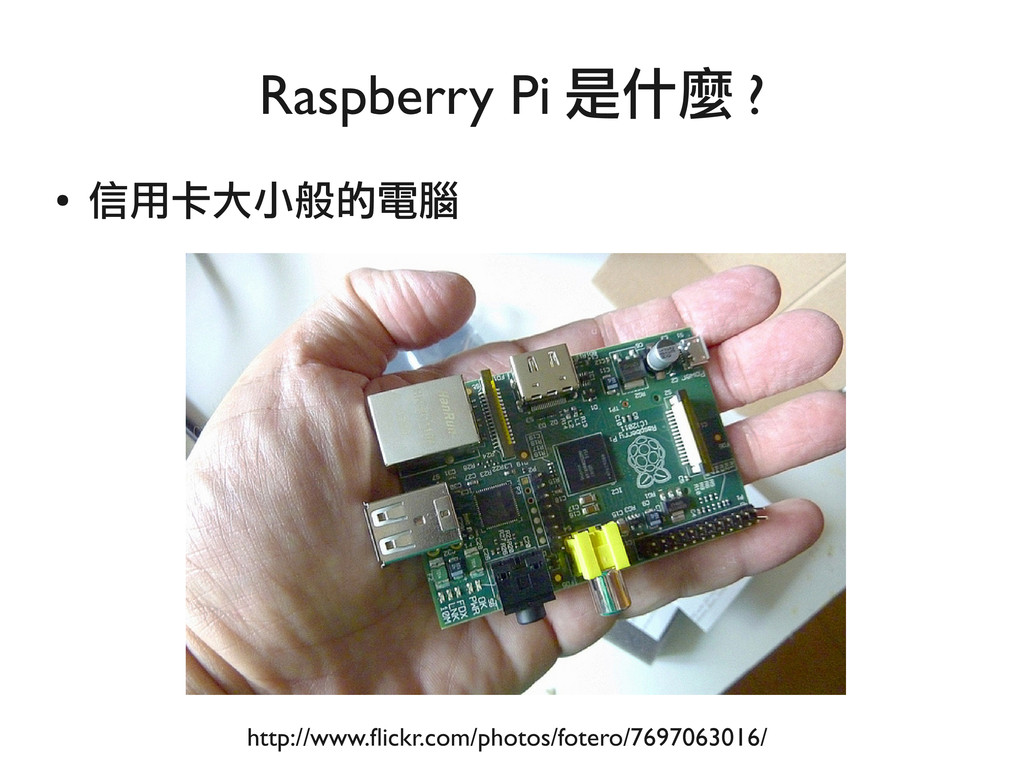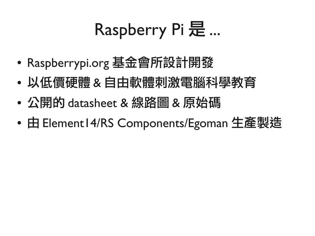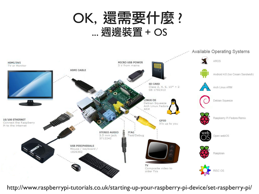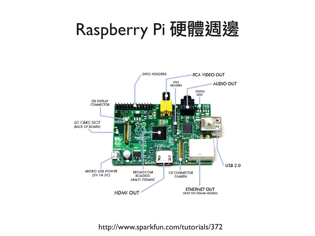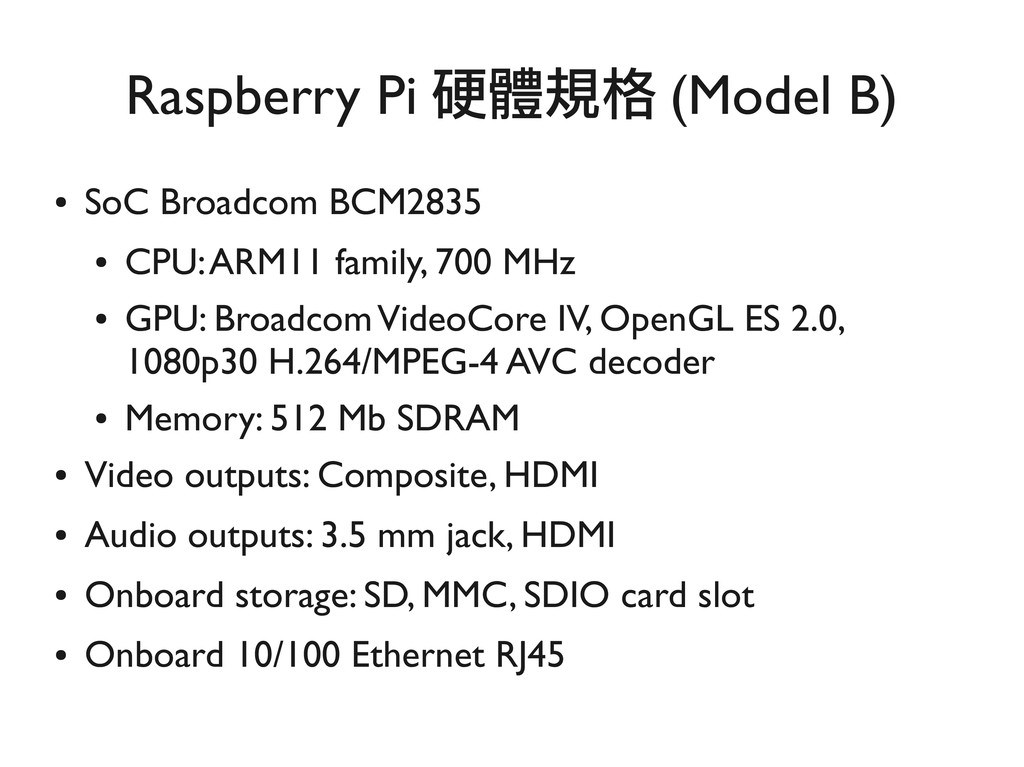• GPU: Broadcom VideoCore IV, OpenGL ES 2.0, 1080p30 H.264/MPEG-4 AVC decoder • Memory: 512 Mb SDRAM • Video outputs: Composite, HDMI • Audio outputs: 3.5 mm jack, HDMI • Onboard storage: SD, MMC, SDIO card slot • Onboard 10/100 Ethernet RJ45 Raspberry Pi 硬體規格 (Model B)