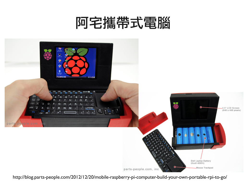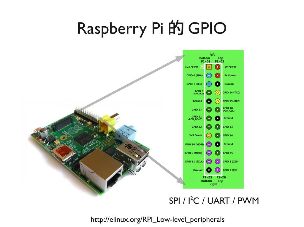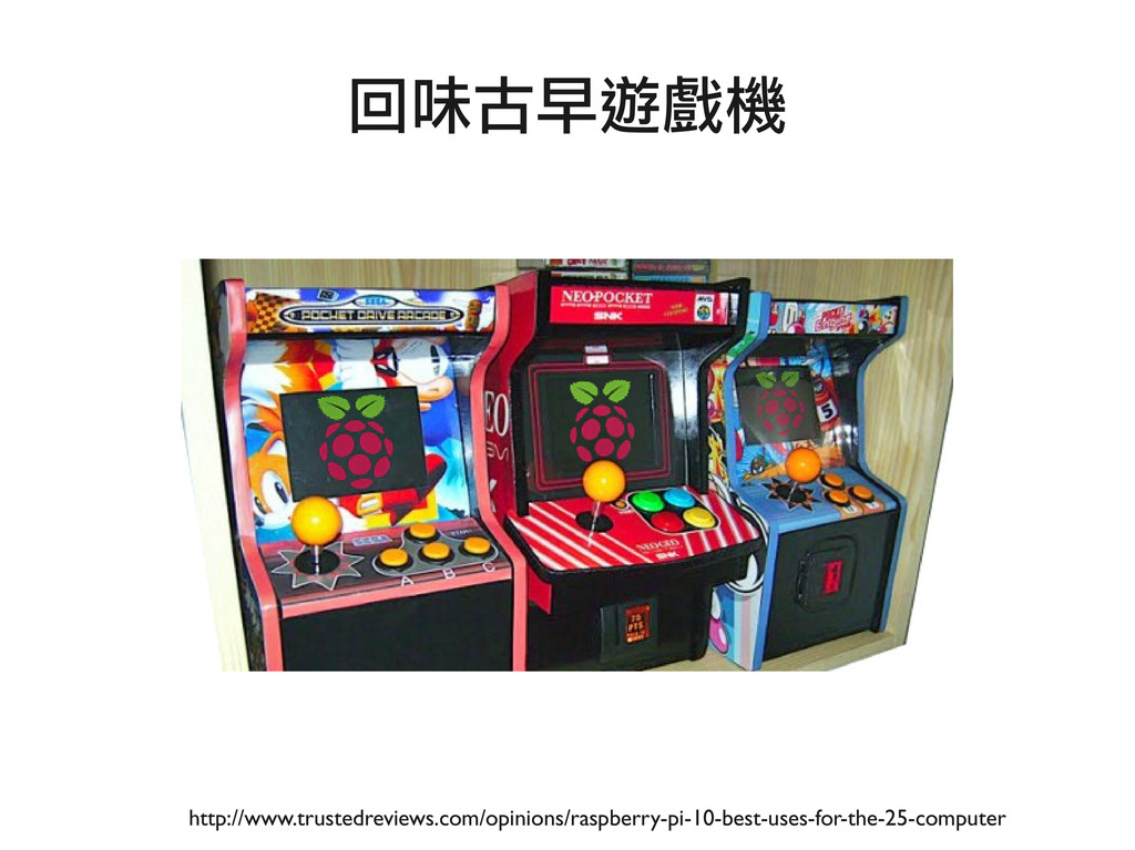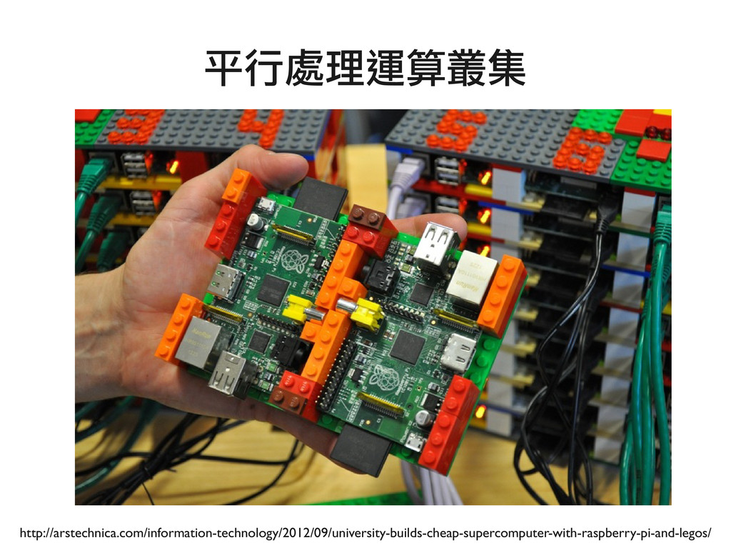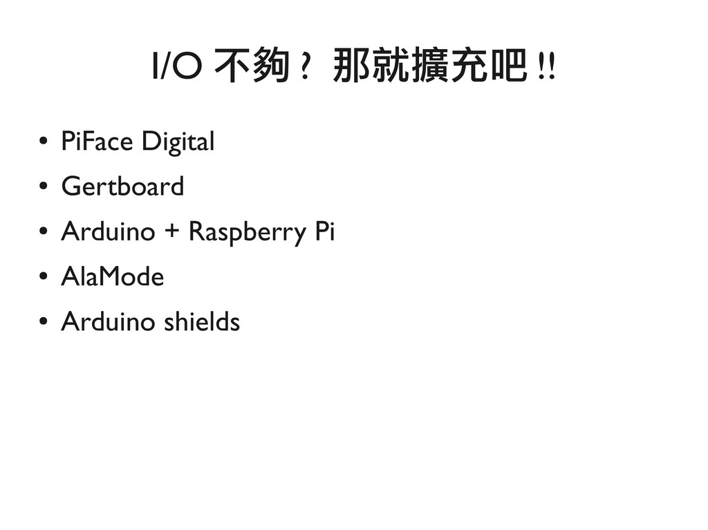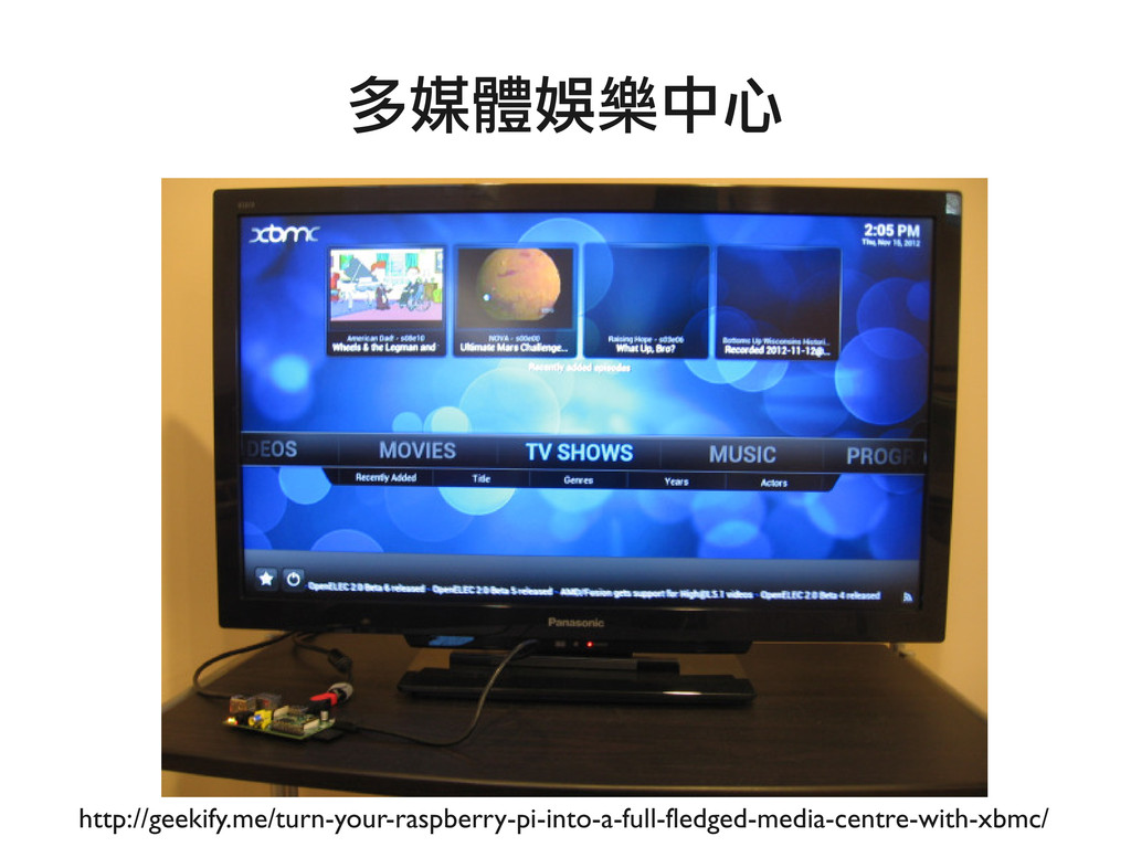 • GPU: Broadcom VideoCore IV, OpenGL ES 2.0, 1080p30 H.264/MPEG-4 AVC decoder • Memory: 512 Mb SDRAM • Video outputs: Composite, HDMI • Audio outputs: 3.5 mm jack, HDMI • Onboard storage: SD, MMC, SDIO card slot • Onboard 10/100 Ethernet RJ45 Raspberry Pi 硬體規格 (Model B)