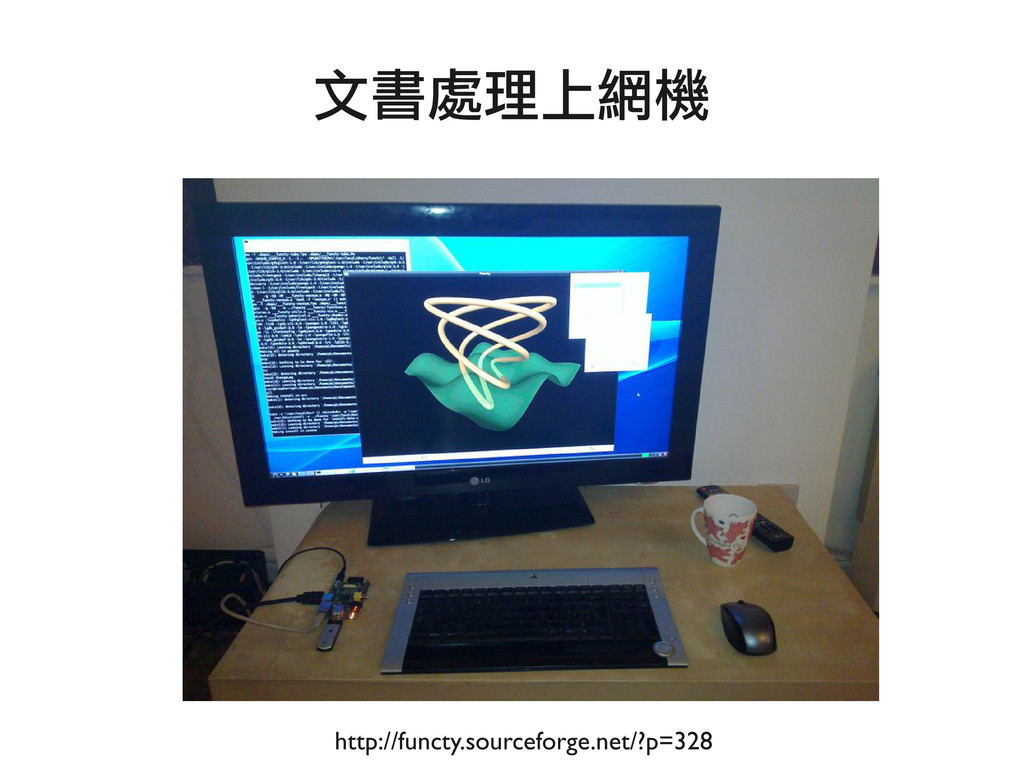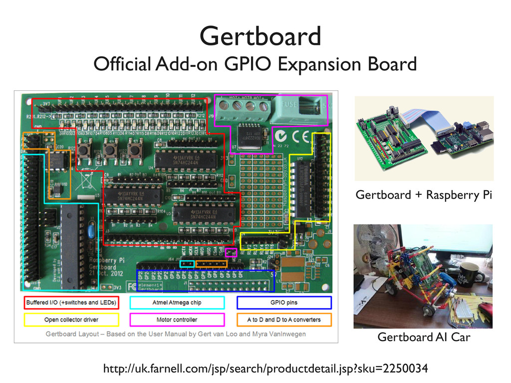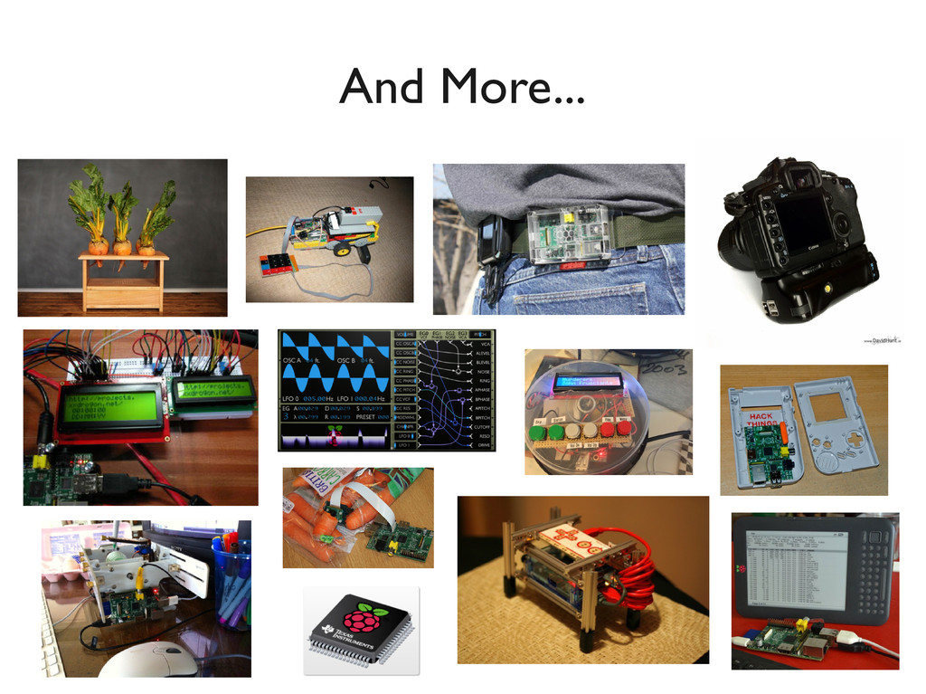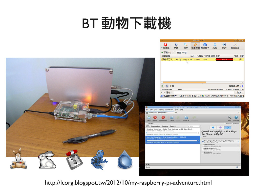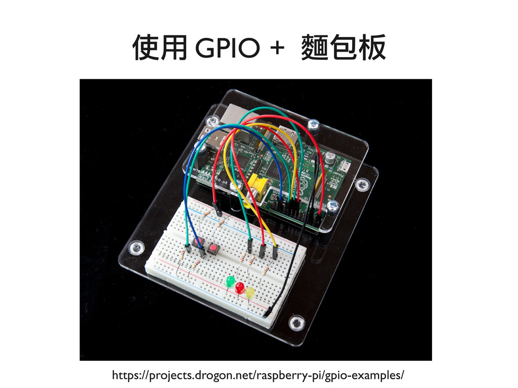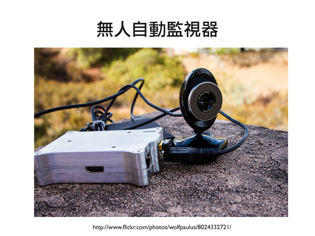 • GPU: Broadcom VideoCore IV, OpenGL ES 2.0, 1080p30 H.264/MPEG-4 AVC decoder • Memory: 512 Mb SDRAM • Video outputs: Composite, HDMI • Audio outputs: 3.5 mm jack, HDMI • Onboard storage: SD, MMC, SDIO card slot • Onboard 10/100 Ethernet RJ45 Raspberry Pi 硬體規格 (Model B)
