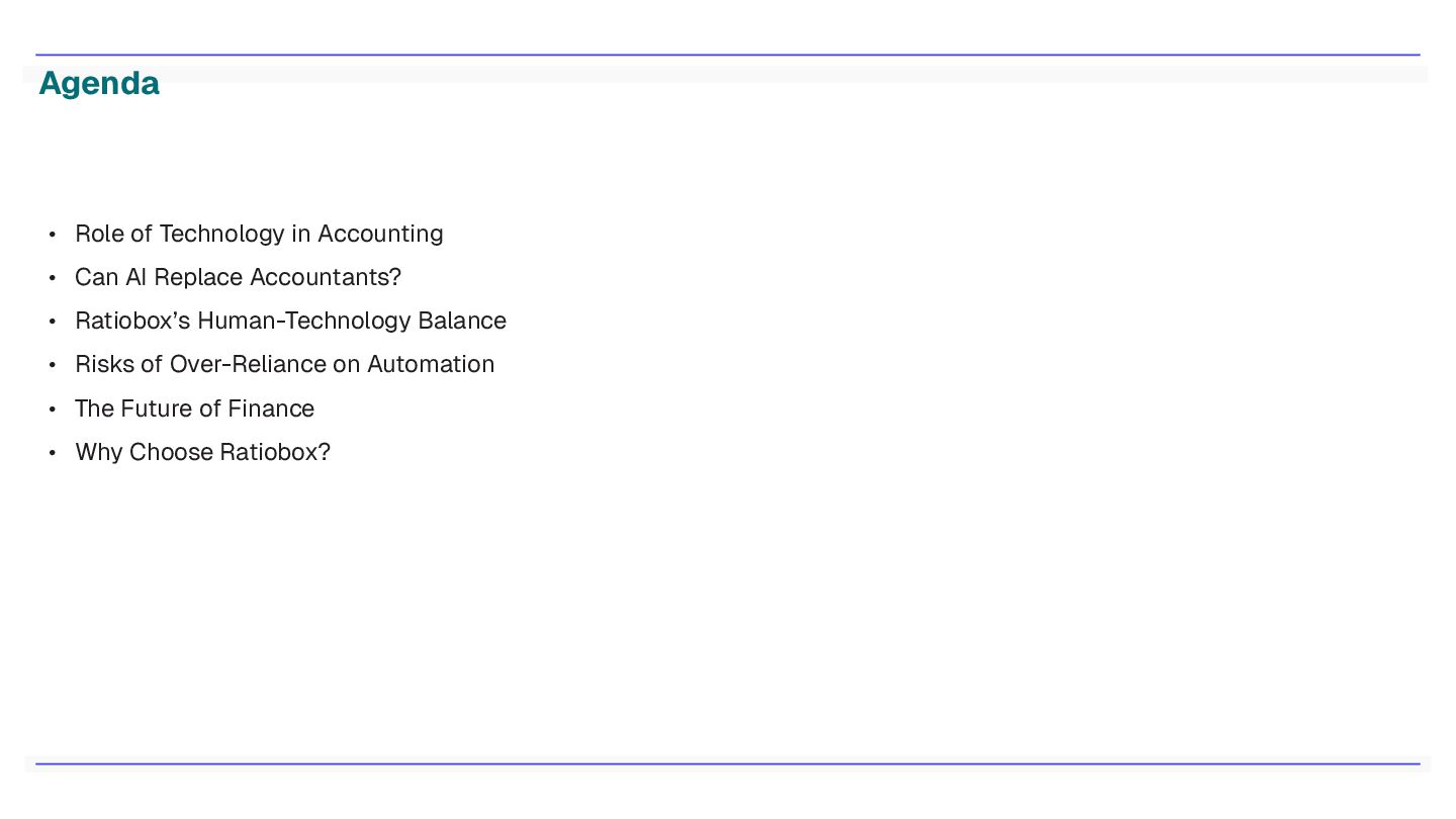 This presentation explores whether AI can replace accountants and explains why human expertise remains essential. It highlights how Ratiobox blends automation with professional judgement to deliver accurate, ethical, and reliable accounting services.