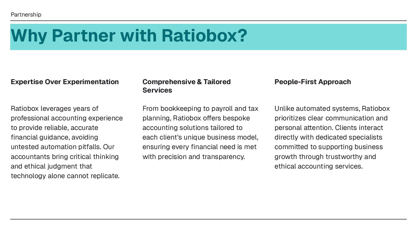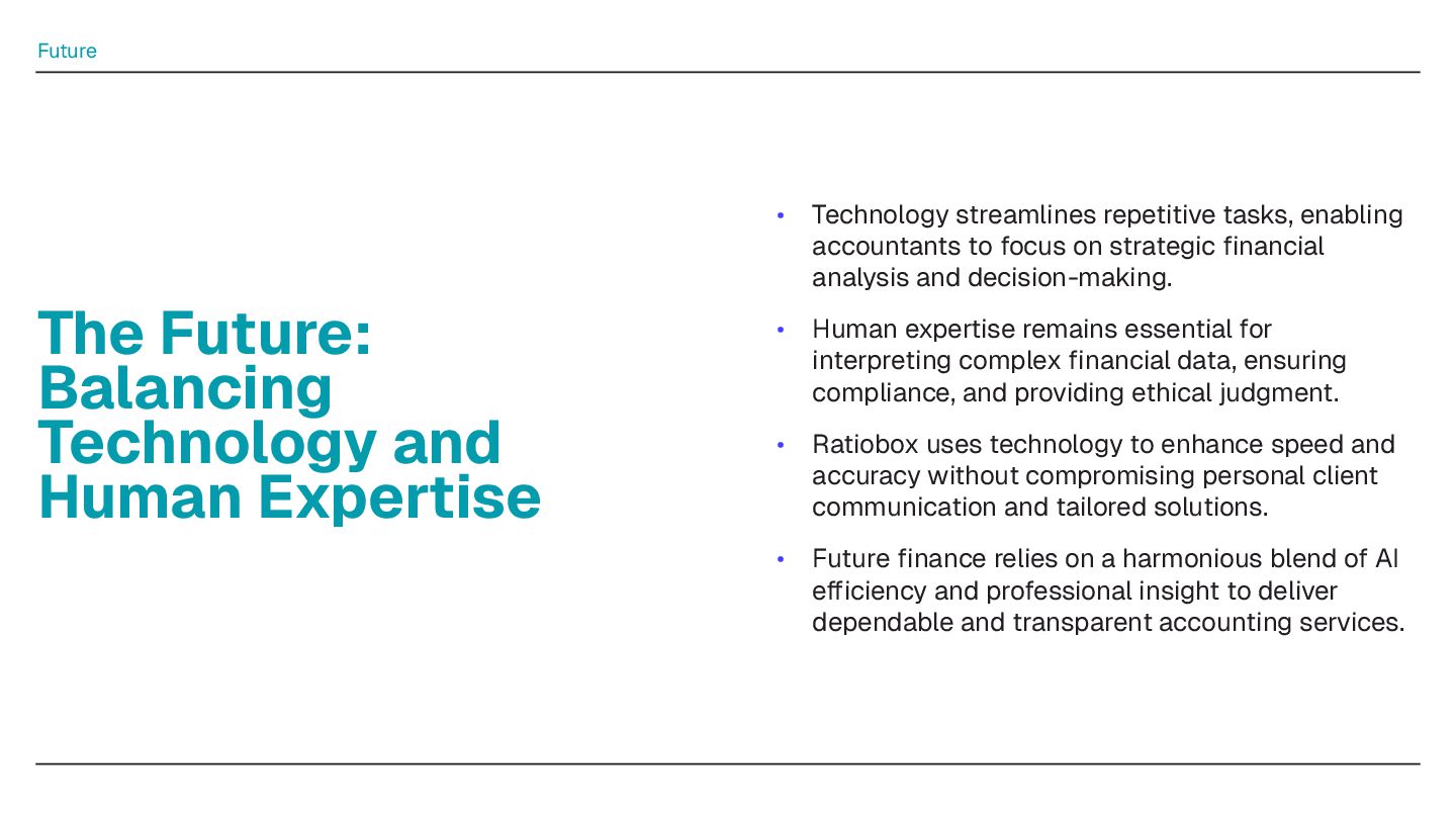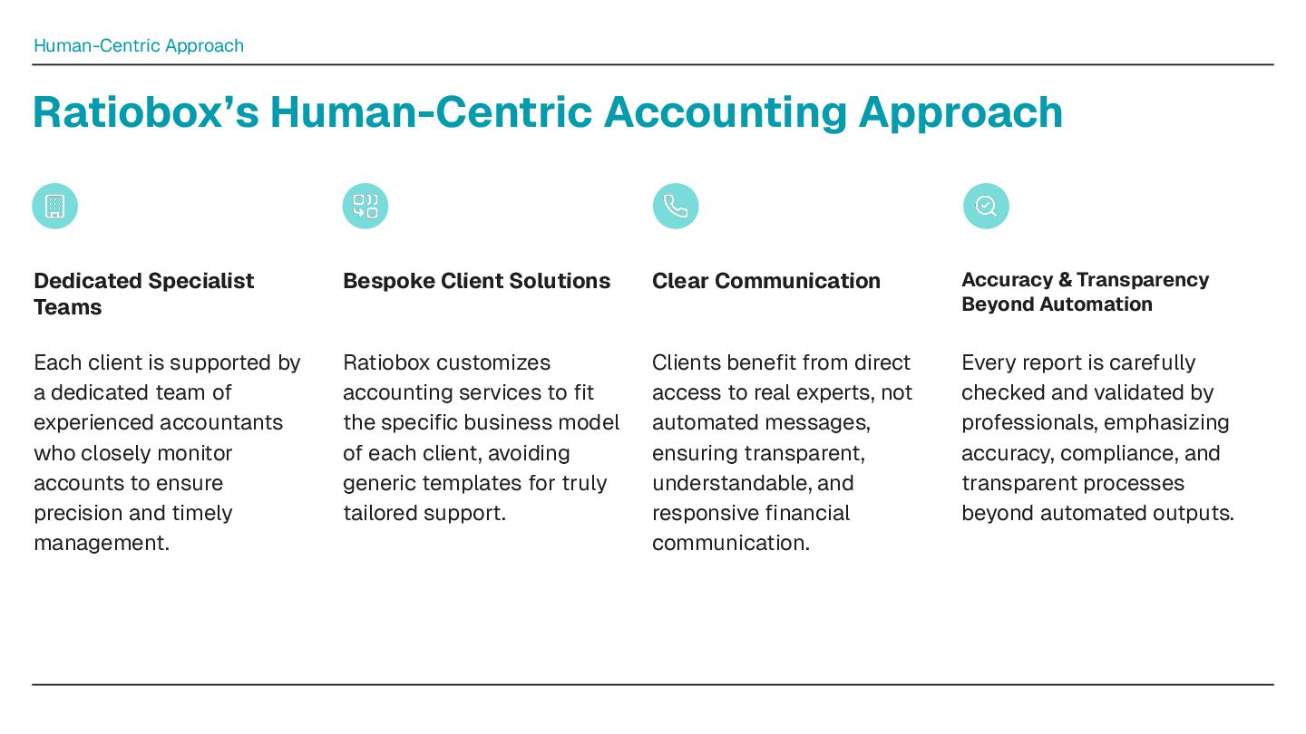 Learn how technology supports efficiency while Ratiobox’s specialists ensure compliance, clarity, and tailored financial guidance.