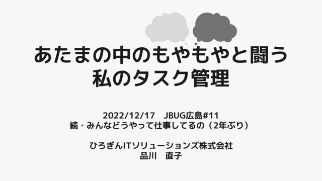 あたまの中のもやもやと闘う 私のタスク管理 2022/12/17 JBUG広島#11 続・みんなどうやって仕事してるの(2年ぶり) ひろぎんITソリューションズ株式会社 品川 直子