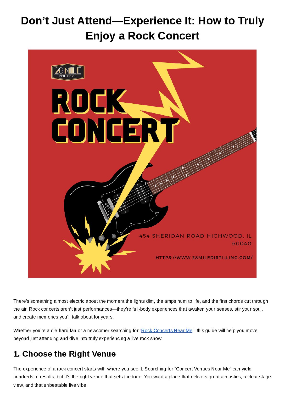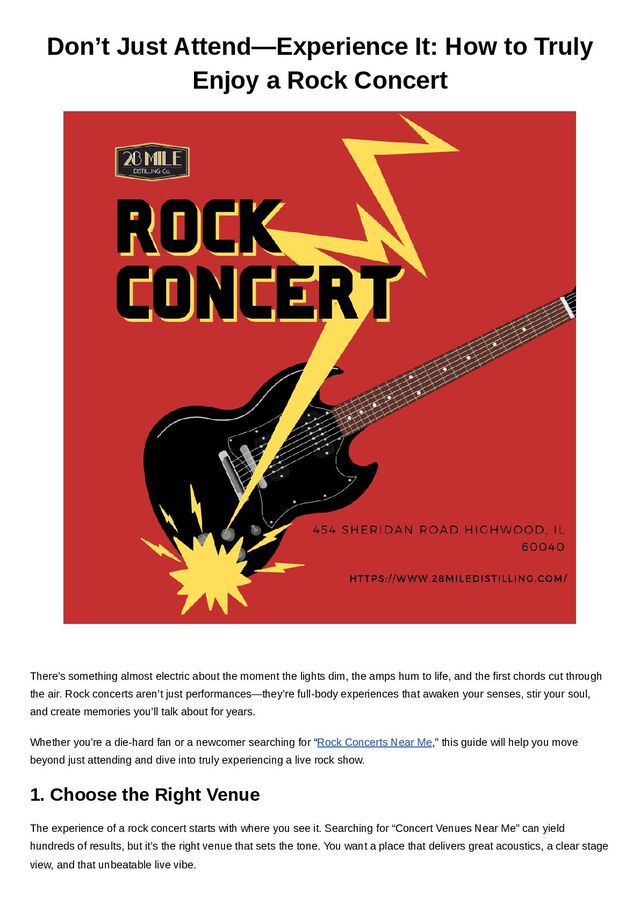 is 28 Mile Distilling Co. in Highwood, IL. With its chic Art Deco décor, spacious lounge-style seating, and top-tier sound system, it’s quickly becoming one of the most unique and sought- after concert venues in the area. 2. Prep Like a Pro To really experience a rock concert, a little prep goes a long way: 🎟 Buy your tickets in advance. The best shows—and the best spots—fill up fast. 👟 Dress for standing, dancing, and possibly spilling your drink (it's part of the fun). 🎧 Get familiar with the band’s setlist ahead of time if it’s your first show—it’ll make the whole experience more immersive. 📱 Check the venue’s policies on bags, photography, and re-entry so you're not caught off guard. 3. Arrive Early, Stay Present Don’t be fashionably late. Arriving early allows you to scope out the space, grab a good spot near the stage, and maybe even catch the opening act—often a rising local band on the brink of something big. And once the music starts? Put the phone down. Snap a few pictures, sure, but let yourself be fully present. Let the volume shake your chest, feel the crowd's energy, and sing at the top of your lungs. That’s what rock is all about. 4. Embrace the Crowd Energy Part of what makes rock concerts unforgettable is the shared energy of the crowd. Strangers become friends. Everyone knows the words. There’s a sense of unity in the chaos of the chorus. Be kind, be aware of your space, and don't be afraid to let loose. Whether it’s a slow sway or a full jump-along with the beat, the crowd is where the magic multiplies. 5. Make a Night of It Don’t just go home after the encore. Extend the experience: Grab a bite or drink at a nearby bar or restaurant. Talk about your favorite moments with friends. Support the band by buying merch—it’s how many indie and local artists keep touring. If you're attending a show at one of the Concert Venues in Highwood, IL, you're in luck. The town is known for its vibrant nightlife and local charm. Places like 28 Mile Distilling Co. not only host live rock concerts but also offer craft cocktails, gourmet pizzas, and a post-show vibe worth sticking around for. Final Riff
