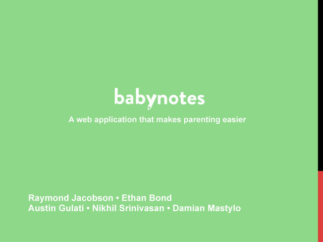 infants and it’s not as easy as it should be to get information What’s out there to solve it? • Baby Connect • Parent Center • The Doctor How they don’t do the problem justice • Don’t provide parents with an easy way to interact with software • Hard to put and get data • It’s just not easy enough… and it needs to be
