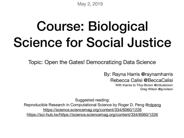 Democratizing Data Science By: Rayna Harris @raynamharris Rebecca Calisi @BeccaCalisi With thanks to Titus Brown @ctitusbrown Greg Wilson @gvwilson Suggested reading: Reproducible Research in Computational Science by Roger D. Peng @rdpeng https://science.sciencemag.org/content/334/6060/1226 https://sci-hub.tw/https://science.sciencemag.org/content/334/6060/1226 May 2, 2019