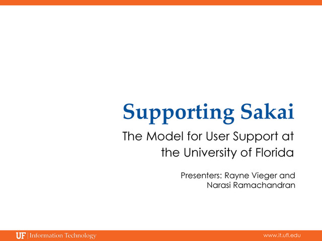 UF Sakai administrators will present the model of support that will include issue reporting, management, documentation, communication and resolution for both faculty and students at the University of Florida. This model can be extended to the broader Sakai community. Attendees of this session may also take away best practices to incorporate into their own support mechanisms.