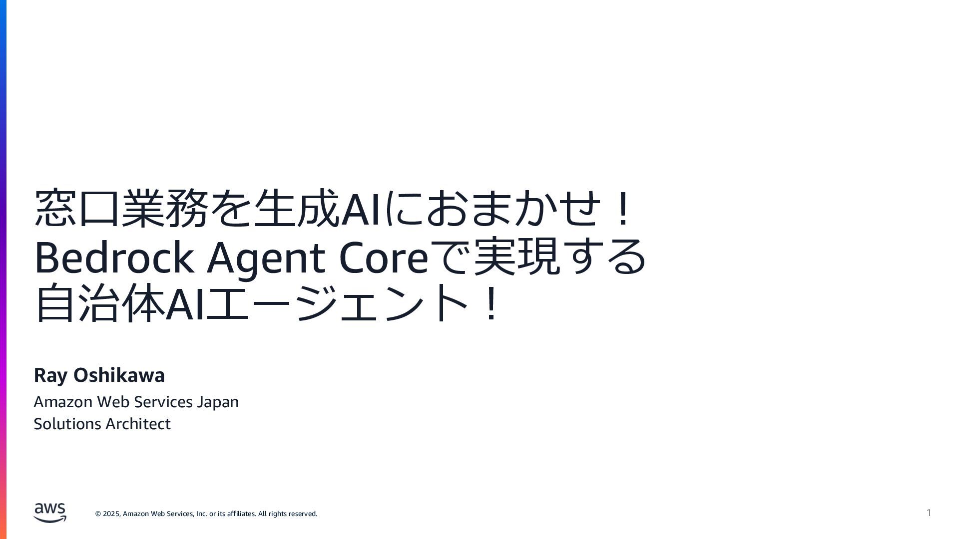rights reserved. 窓⼝業務を⽣成AIにおまかせ︕ Bedrock Agent Coreで実現する ⾃治体AIエージェント︕ Ray Oshikawa Amazon Web Services Japan Solutions Architect 1