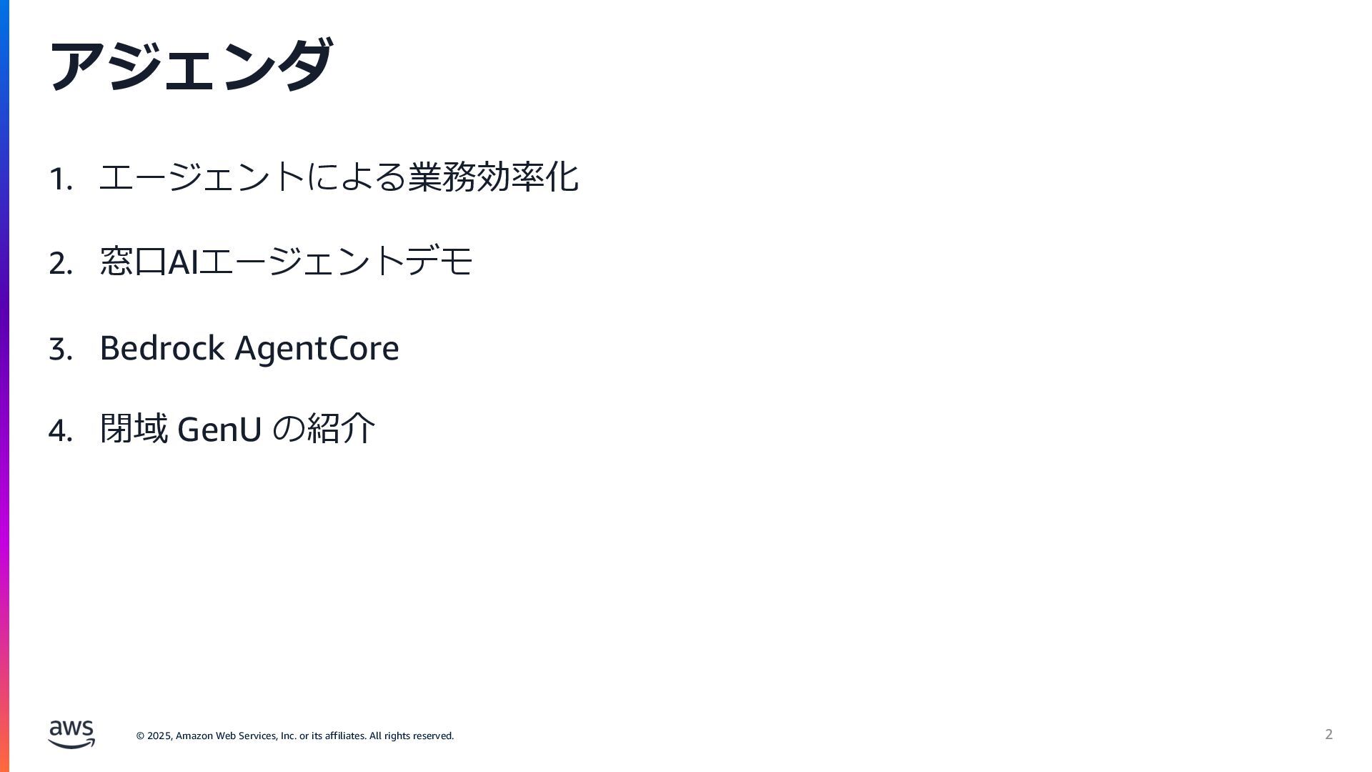 rights reserved. 1. エージェントによる業務効率化 2. 窓⼝AIエージェントデモ 3. Bedrock AgentCore 4. 閉域 GenU の紹介 アジェンダ 2