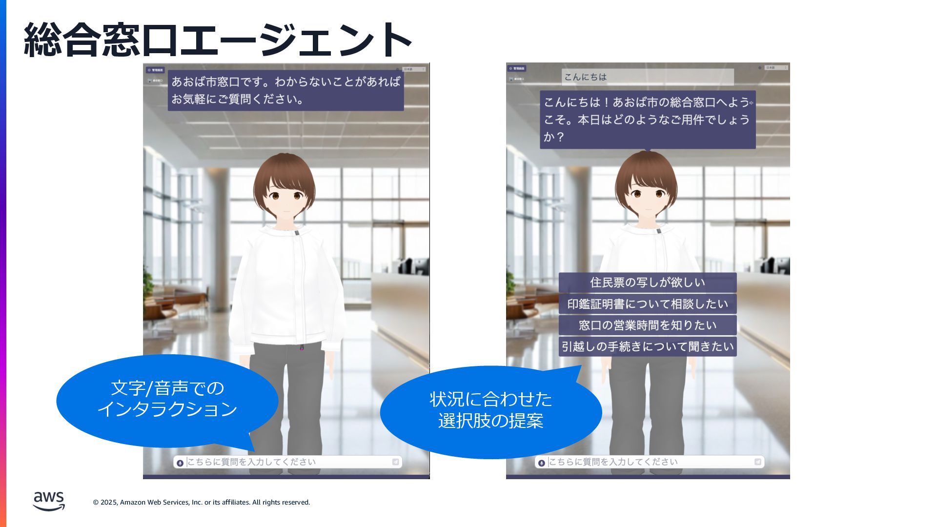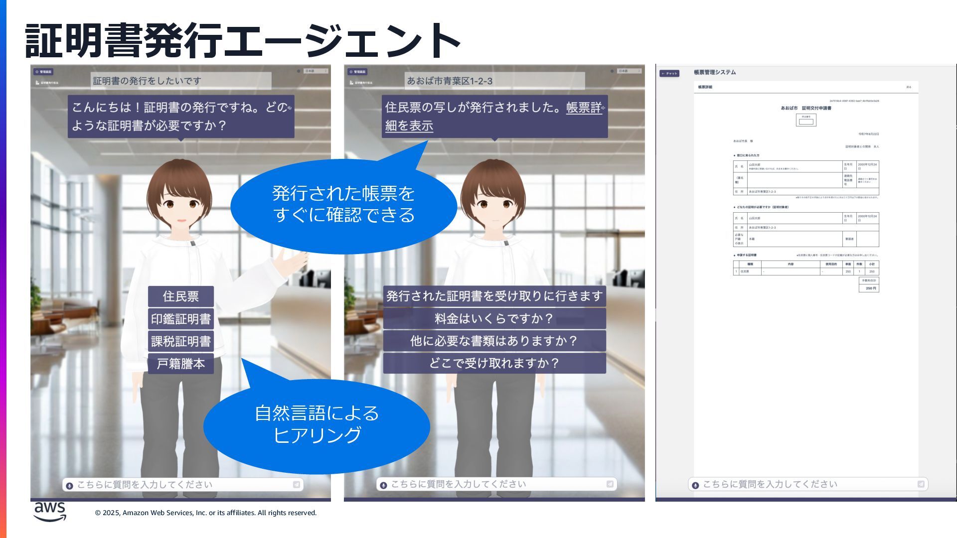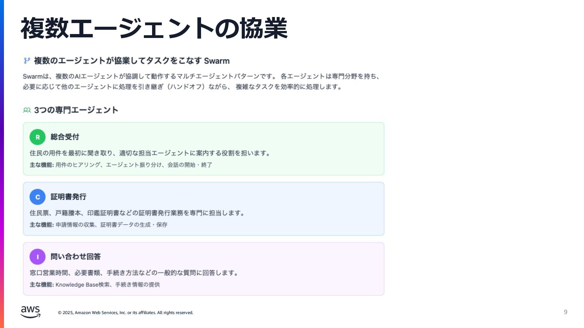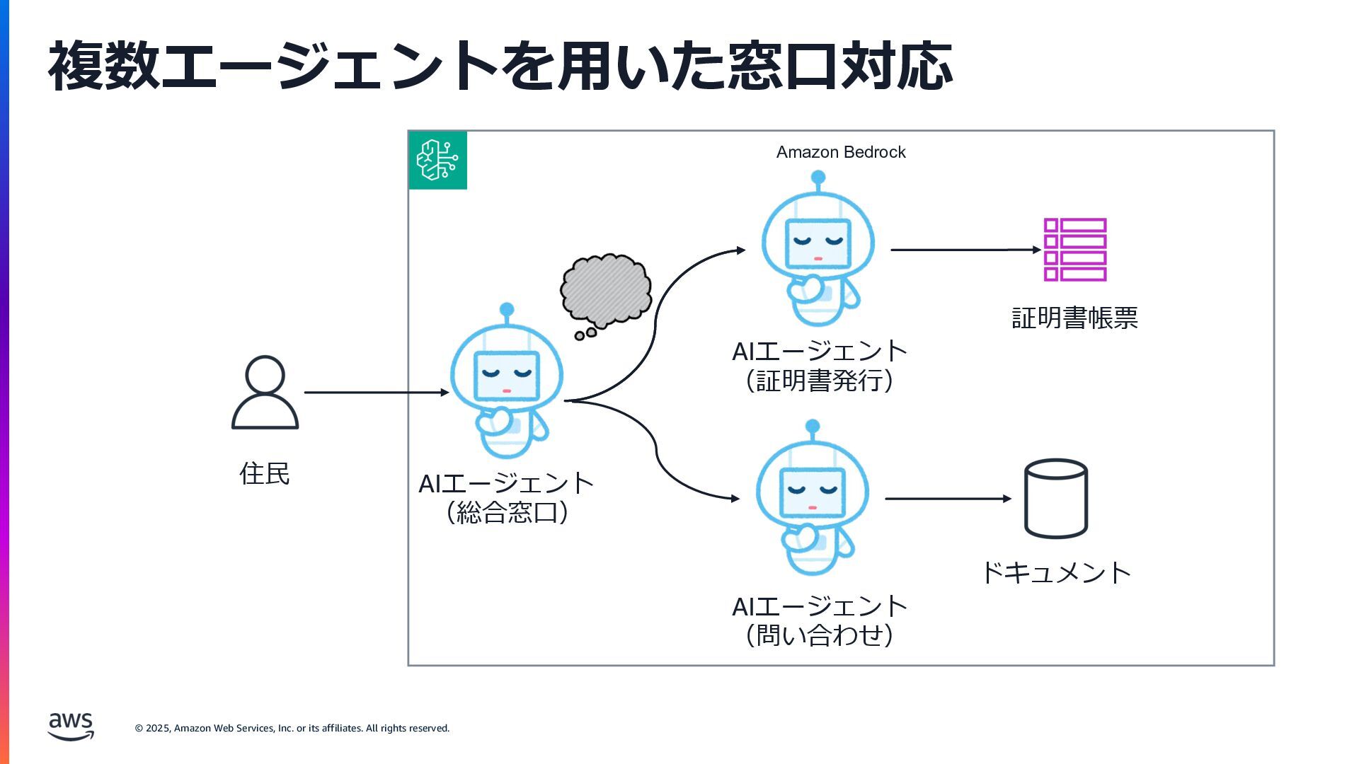 rights reserved. 複数エージェントを⽤いた窓⼝対応 Amazon Bedrock AIエージェント (総合窓⼝) AIエージェント (証明書発⾏) AIエージェント (問い合わせ) 証明書帳票 ドキュメント 住⺠