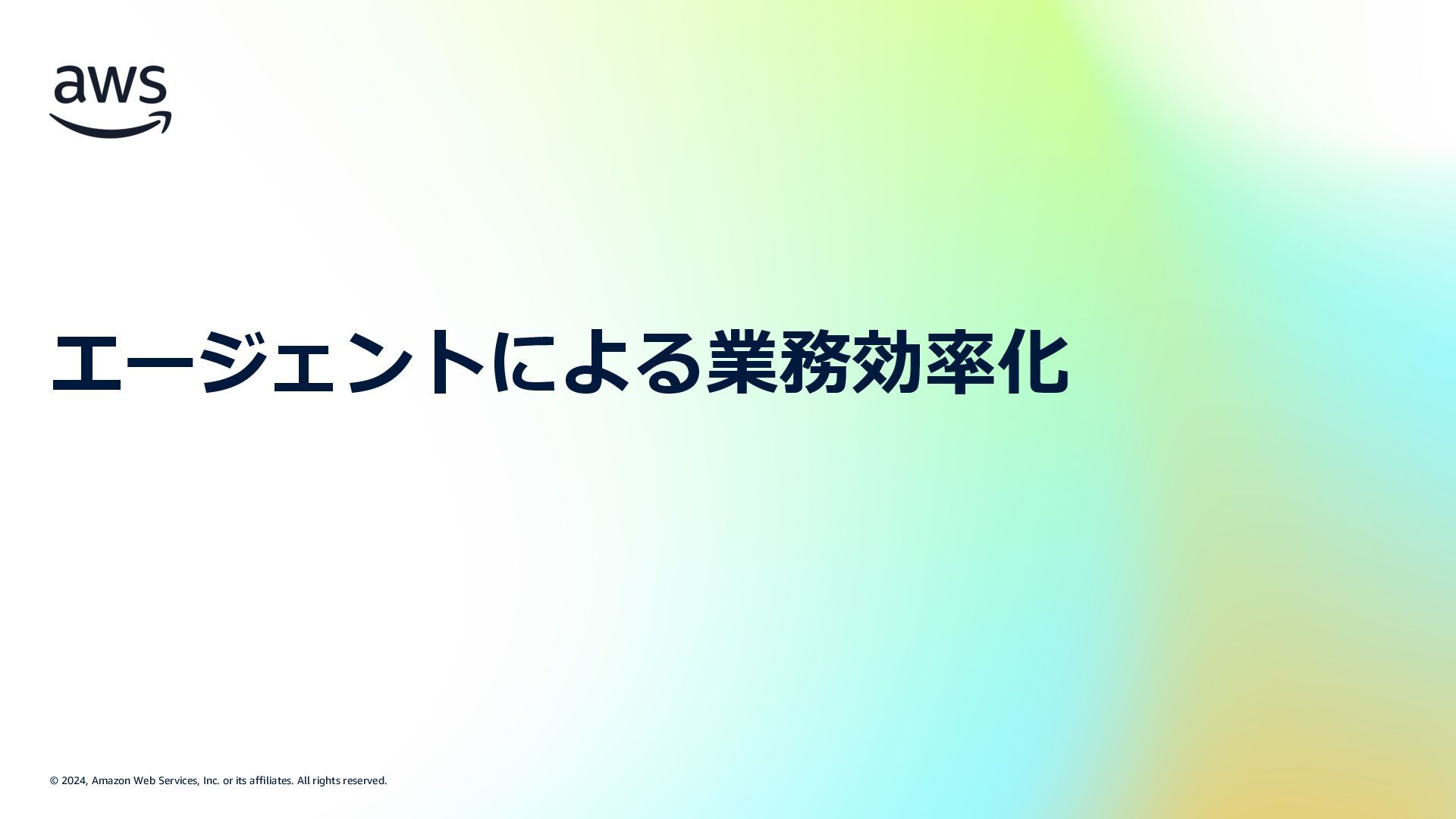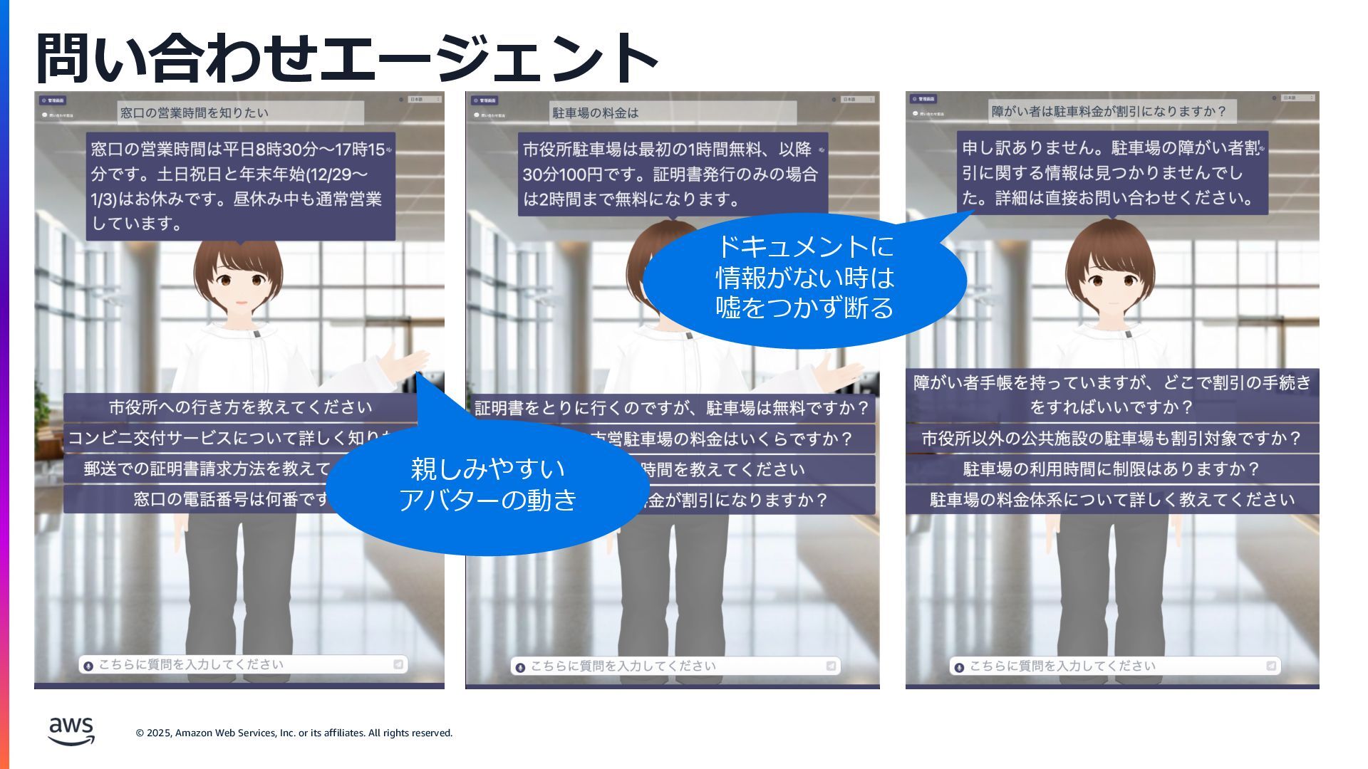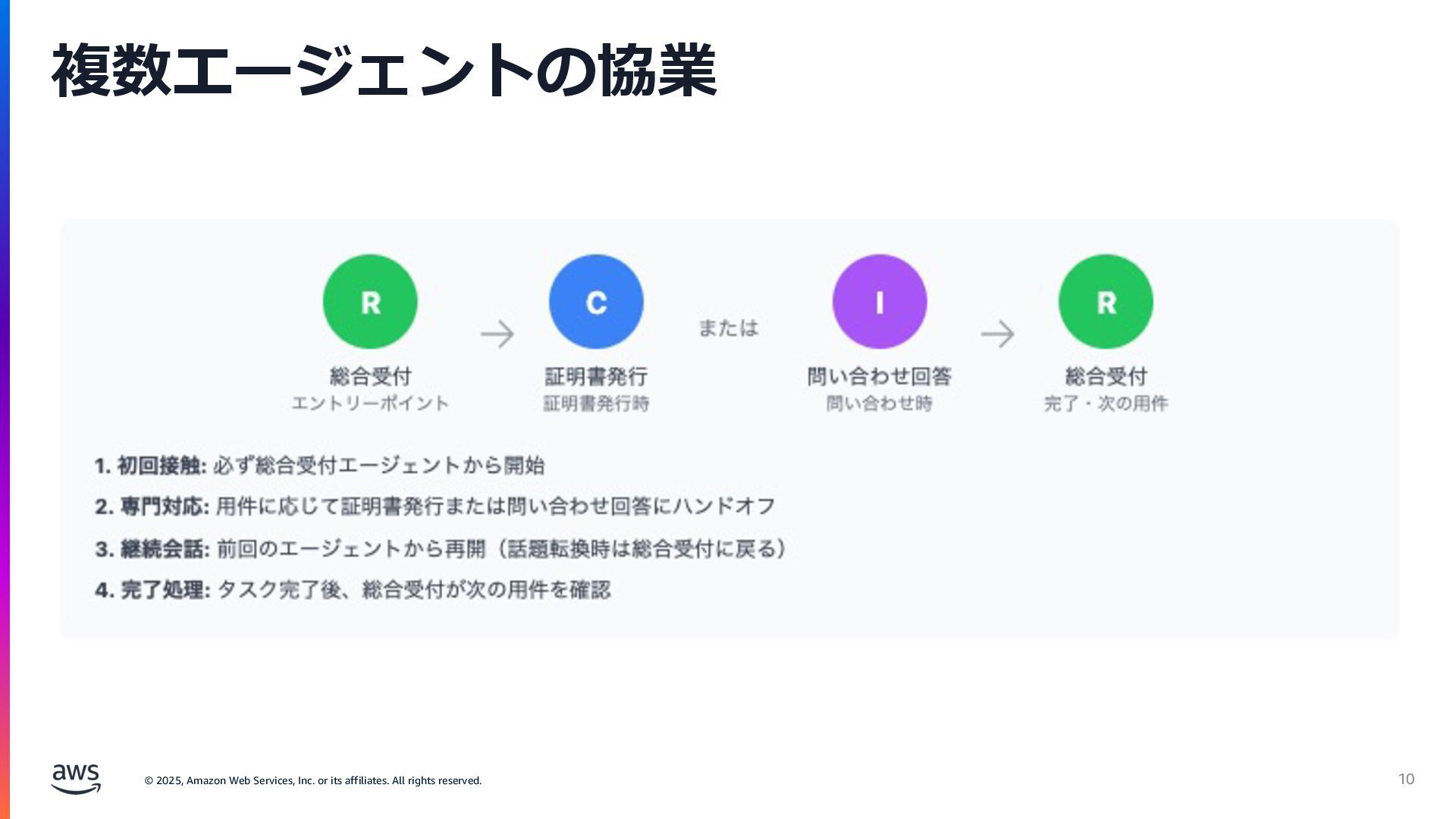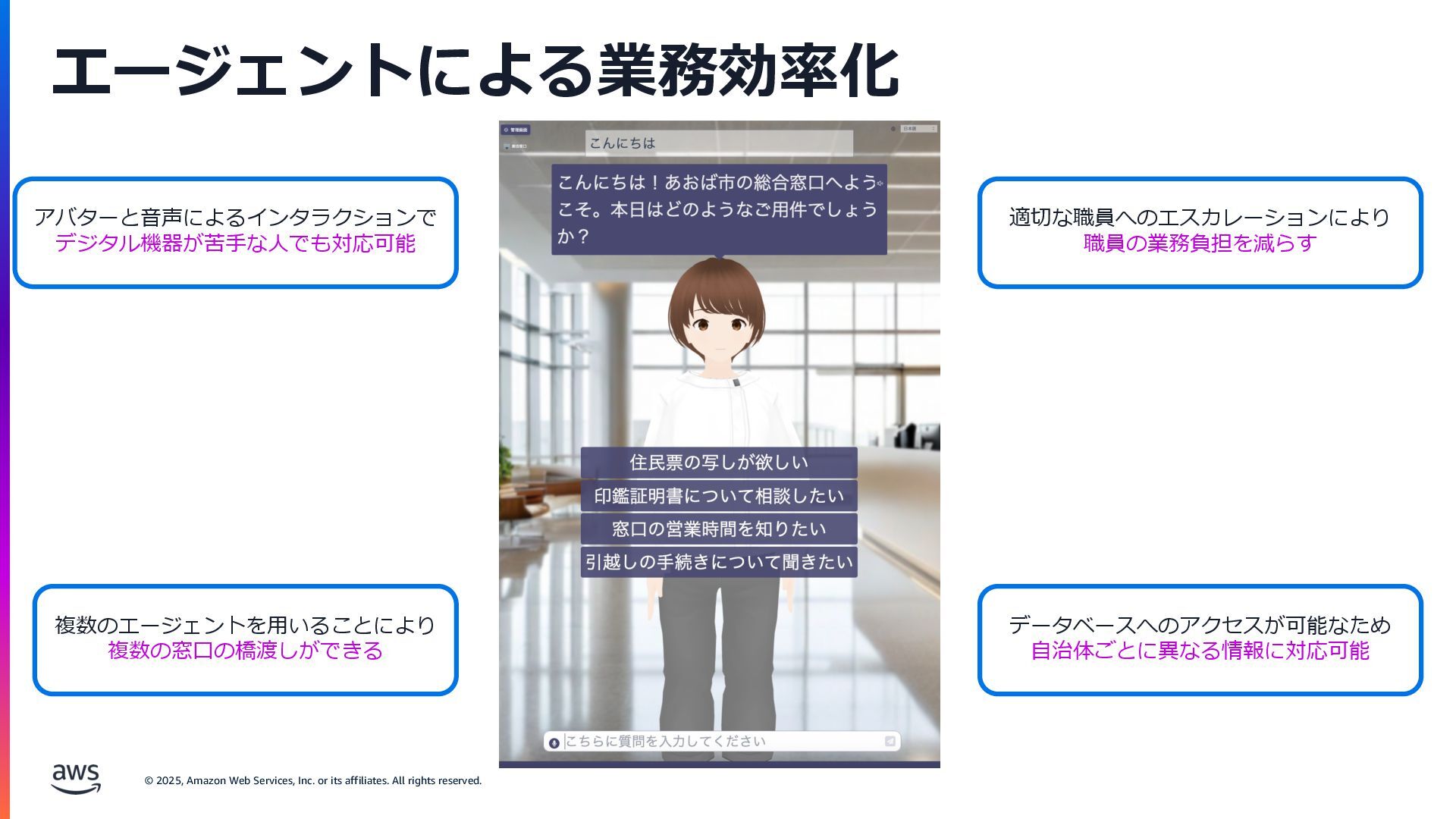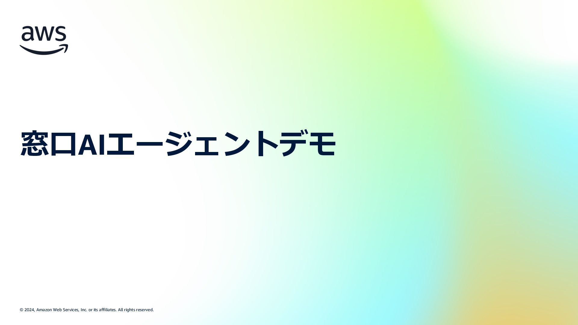 rights reserved. 複数エージェントを⽤いた窓⼝対応 Amazon Bedrock AIエージェント (総合窓⼝) AIエージェント (証明書発⾏) AIエージェント (問い合わせ) 証明書帳票 ドキュメント 住⺠